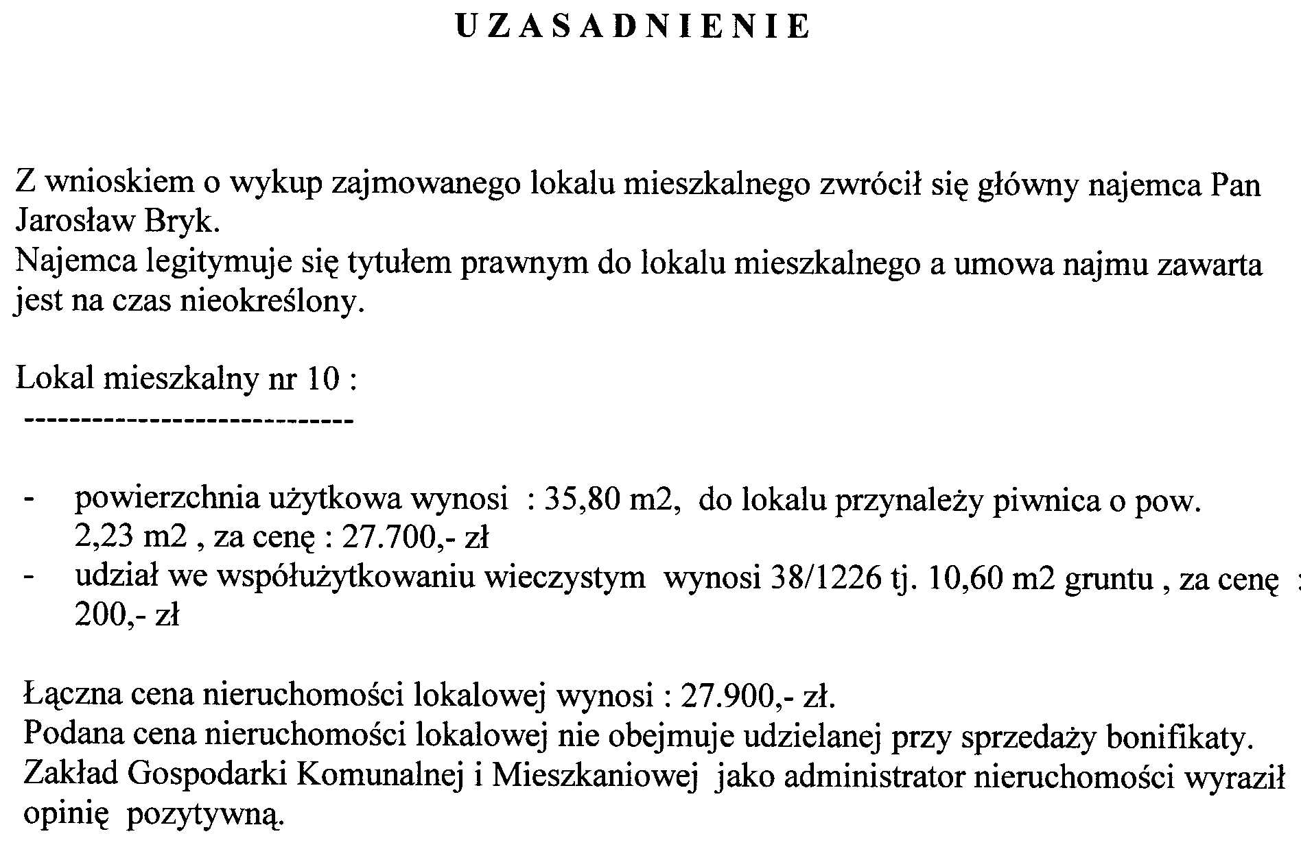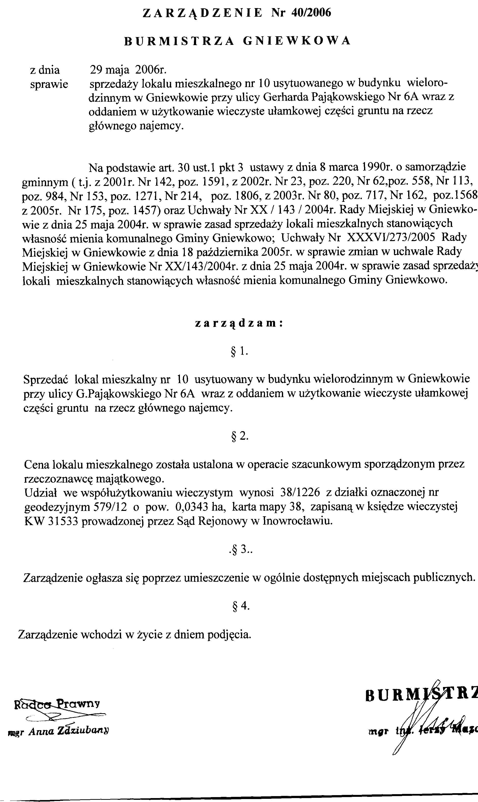 Zarządzenie Nr 40/2006 Burmistrza Gniewkowa z dnia 29.05.2006r. w/s sprzedaży lokalu mieszkalnego nr 10 usytuowanego w budynku wielorodzinnym w Gniewkowie przy ulicy Gerharda Pająkowskiego Nr 6A wraz z oddaniem w użytkowanie wieczyste ułamkowej części gruntu na rzecz głównego najemcy
