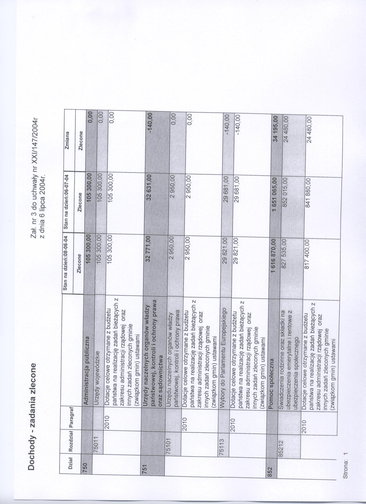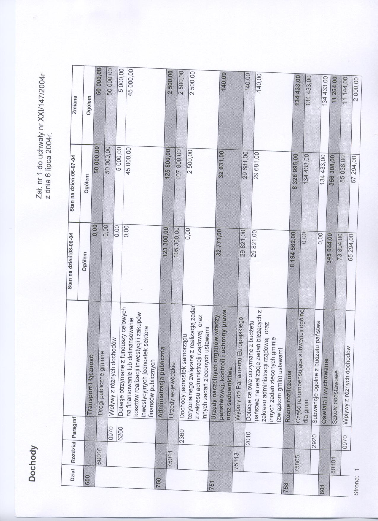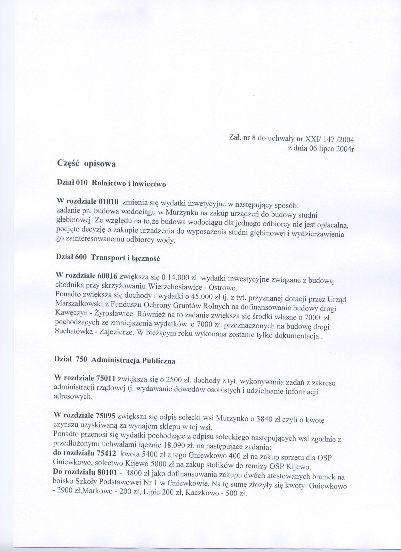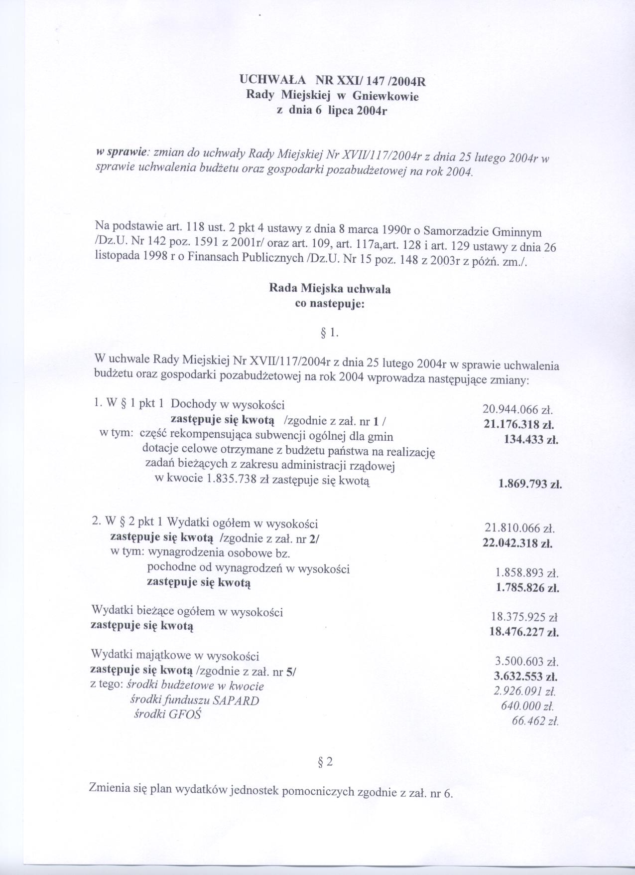 Uchwała Nr XXI/147/2004 z dn. 06.07.04r. w/s zmian do uchwały Rady Miejskiej Nr XVII/117/2004 z dn. 25.02.04r. w/s uchwalenia budżetu oraz godpodarki pozabudżetowej na rok 2004