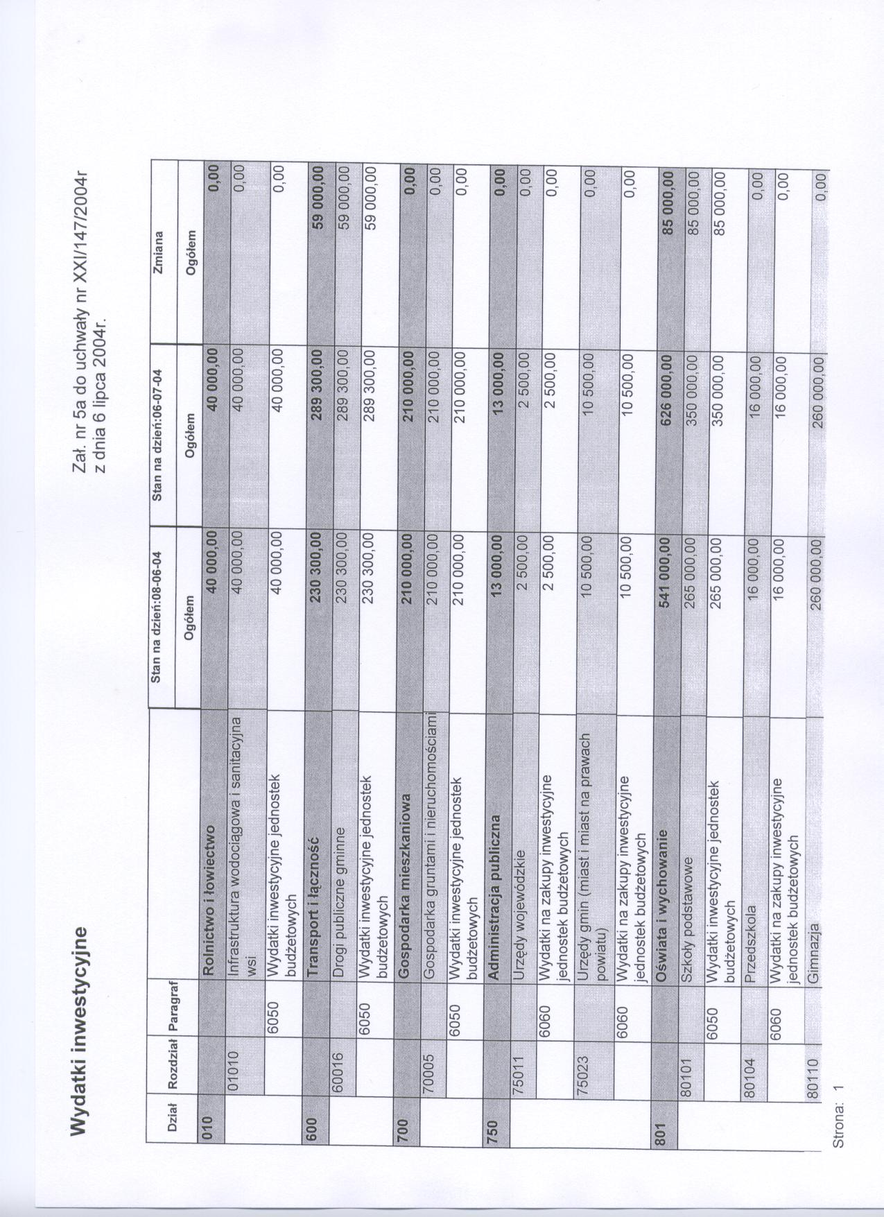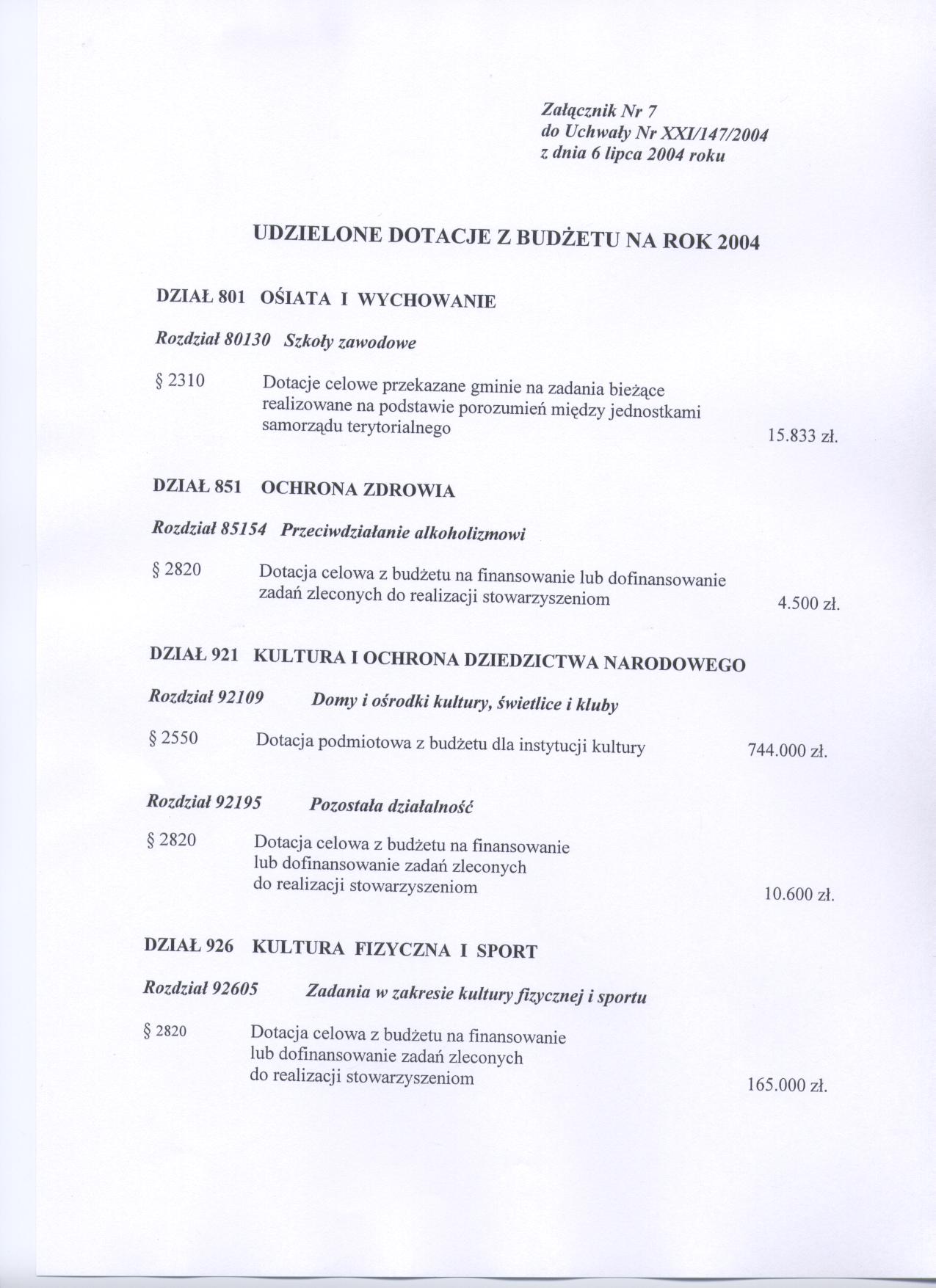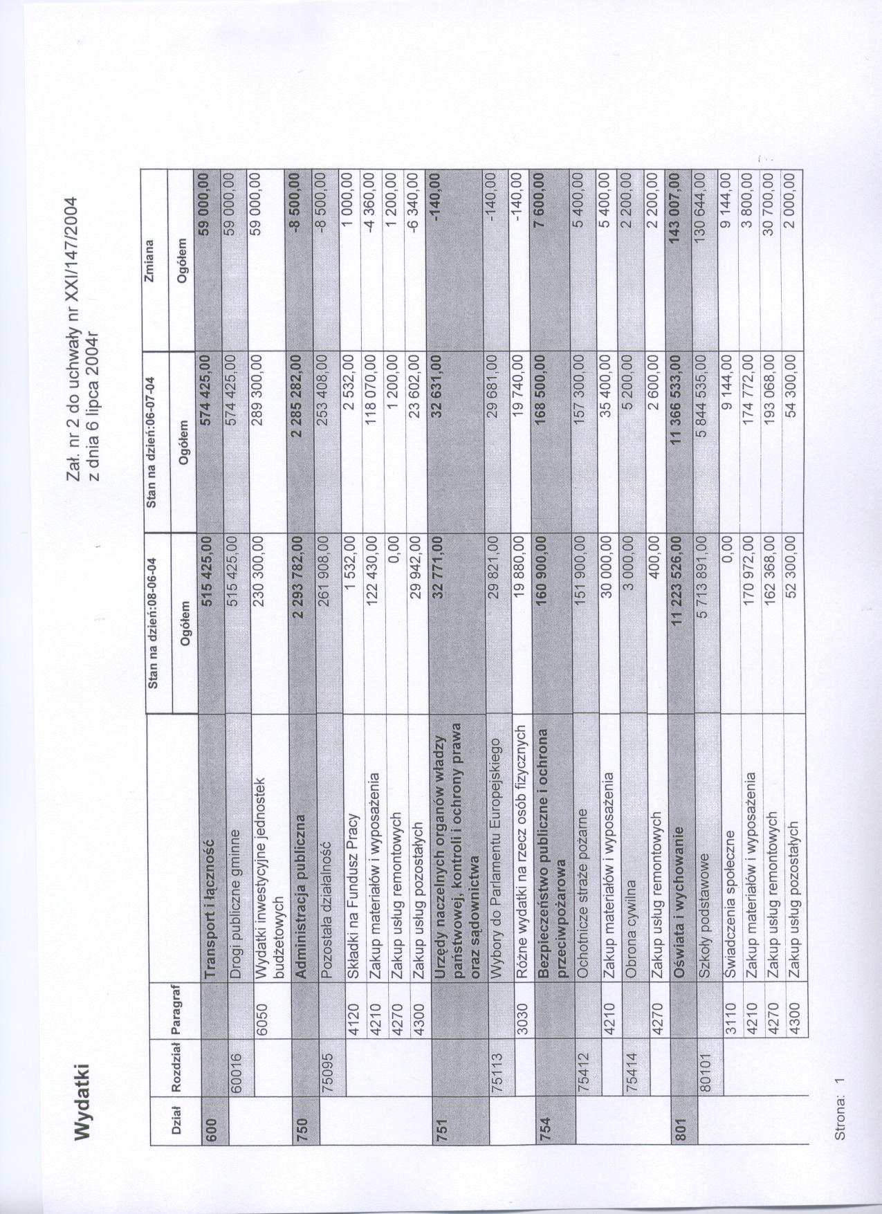 Uchwała Nr XXI/147/2004 z dn. 06.07.04r. w/s zmian do uchwały Rady Miejskiej Nr XVII/117/2004 z dn. 25.02.04r. w/s uchwalenia budżetu oraz godpodarki pozabudżetowej na rok 2004