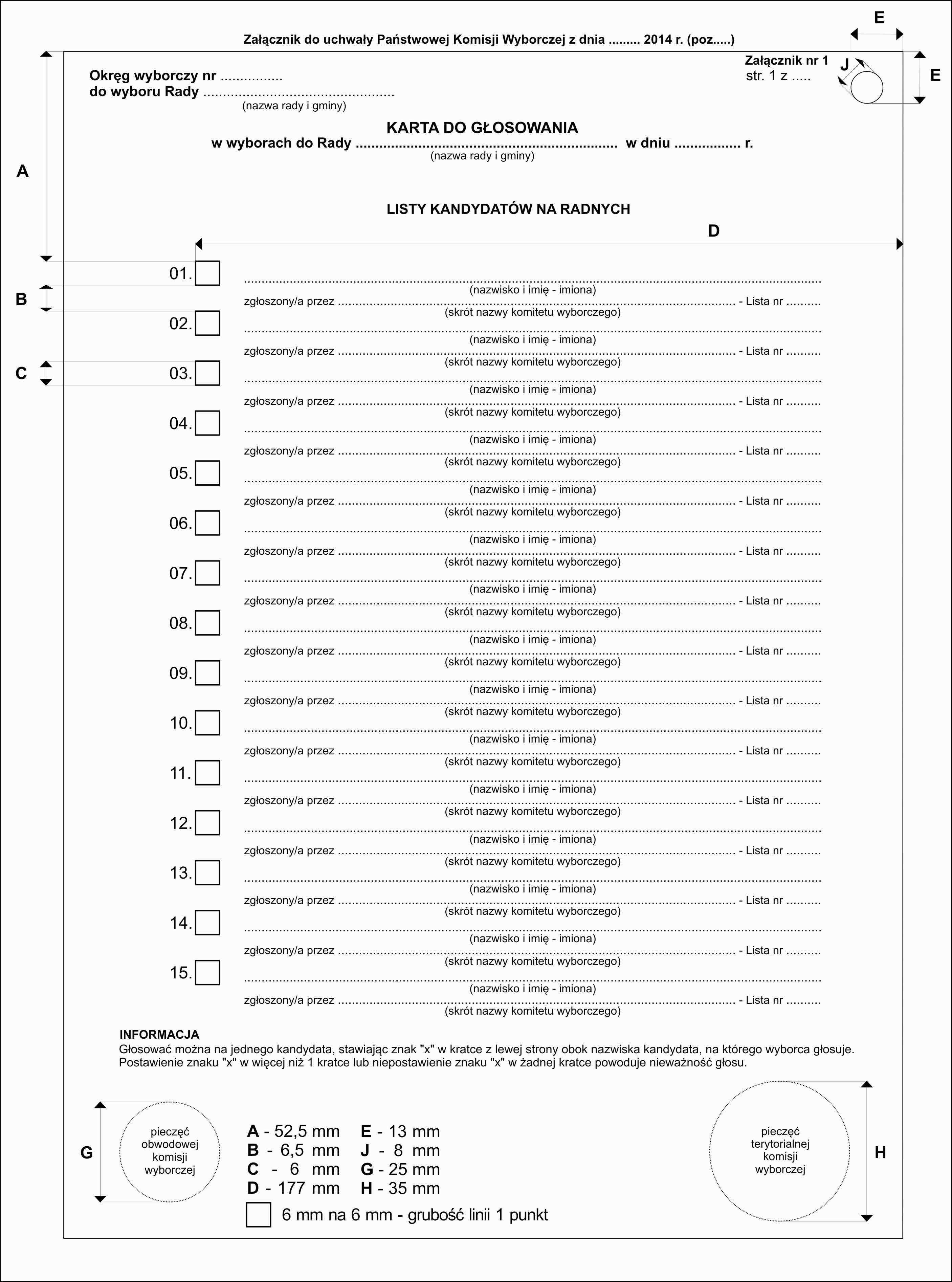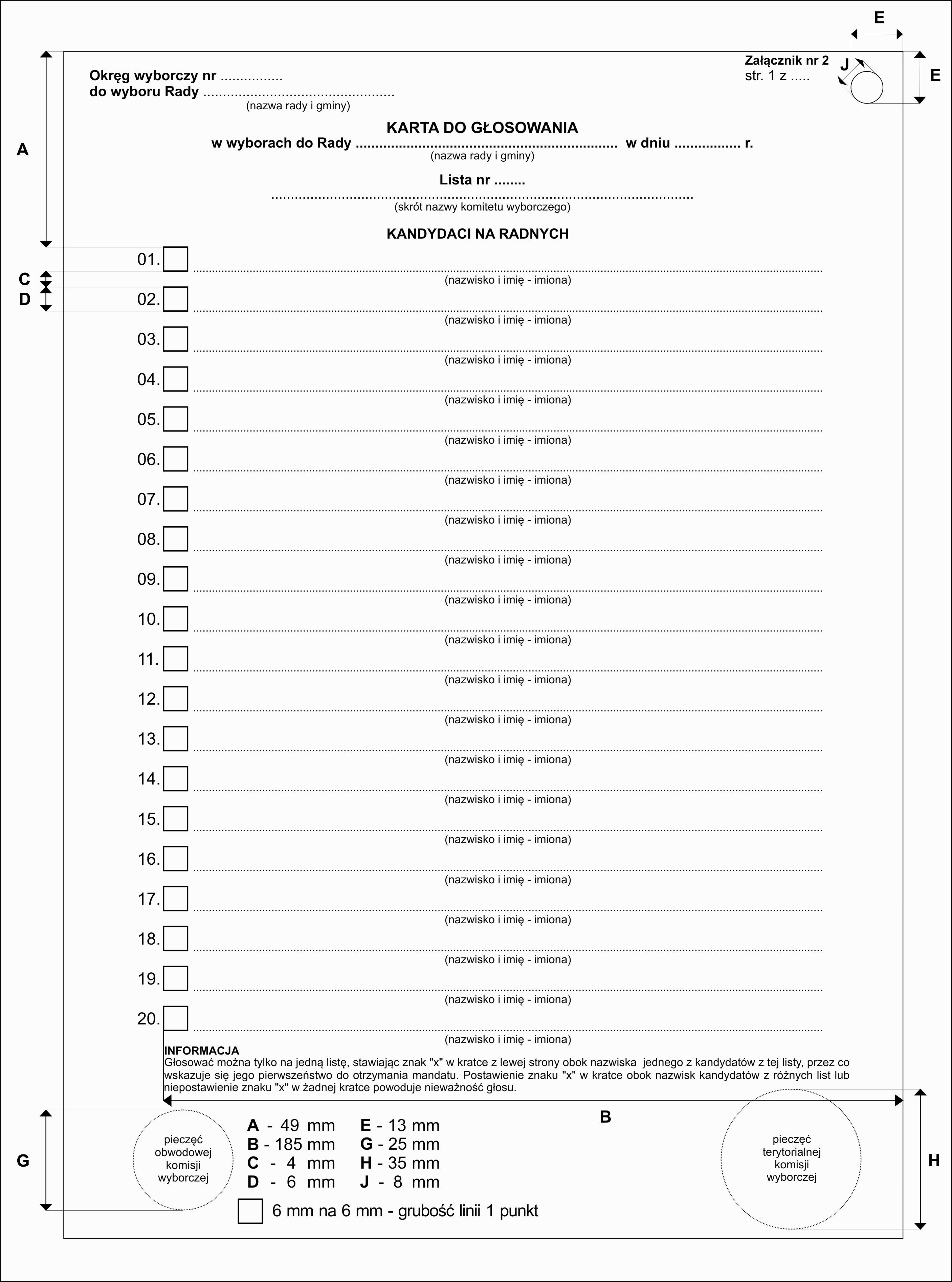 - Każda lista opatrzona jest oznaczeniem „Lista nr ...” oraz skrótem nazwy komitetu wyborczego, który zgłosił listę. Na liście po oznaczeniu „Kandydaci na radnych” umieszcza się w kolejności liczbę porządkową, po niej kratkę przeznaczoną na oddanie głosu oraz nazwisko i imię - imiona każdego kandydata.