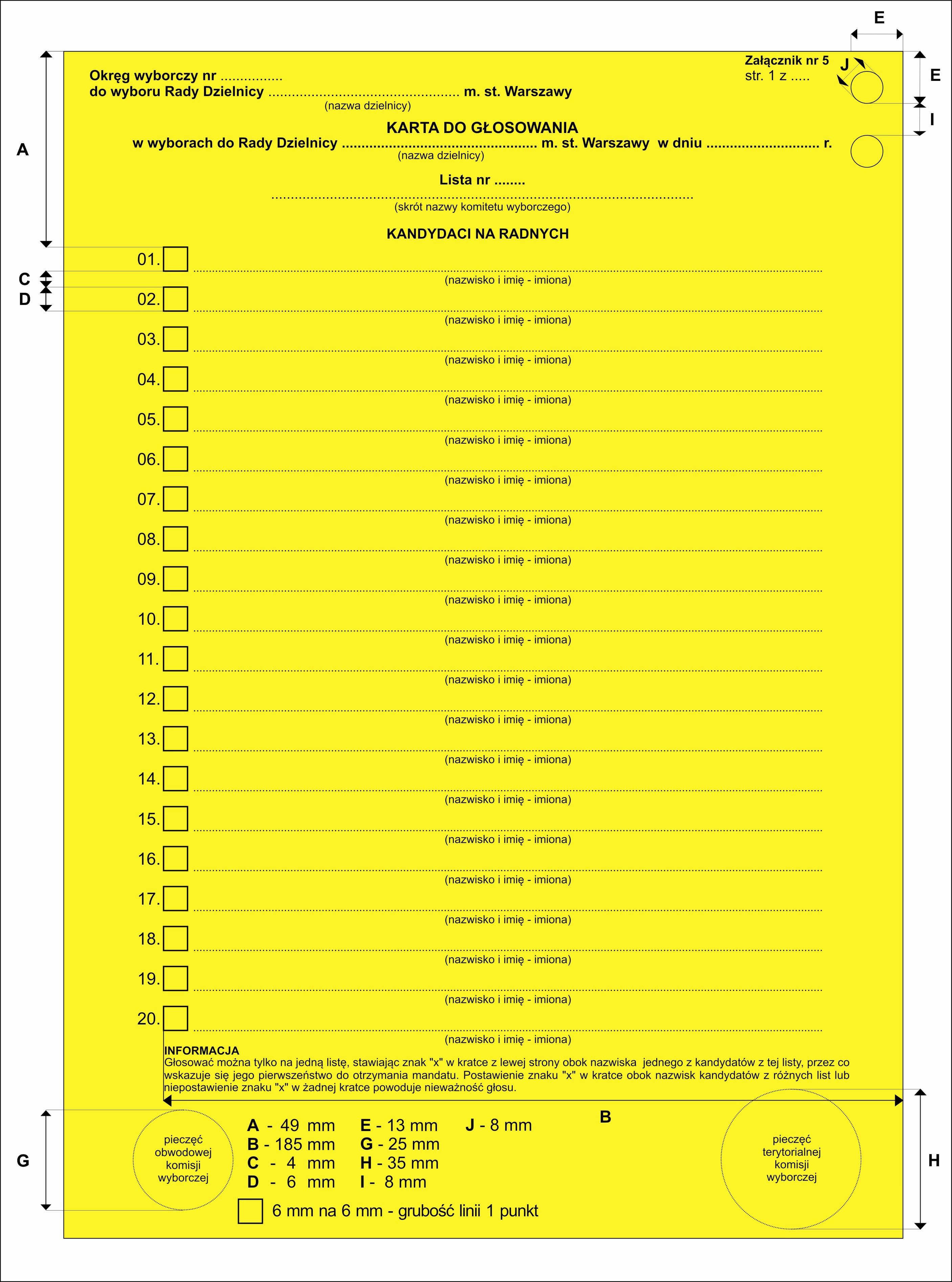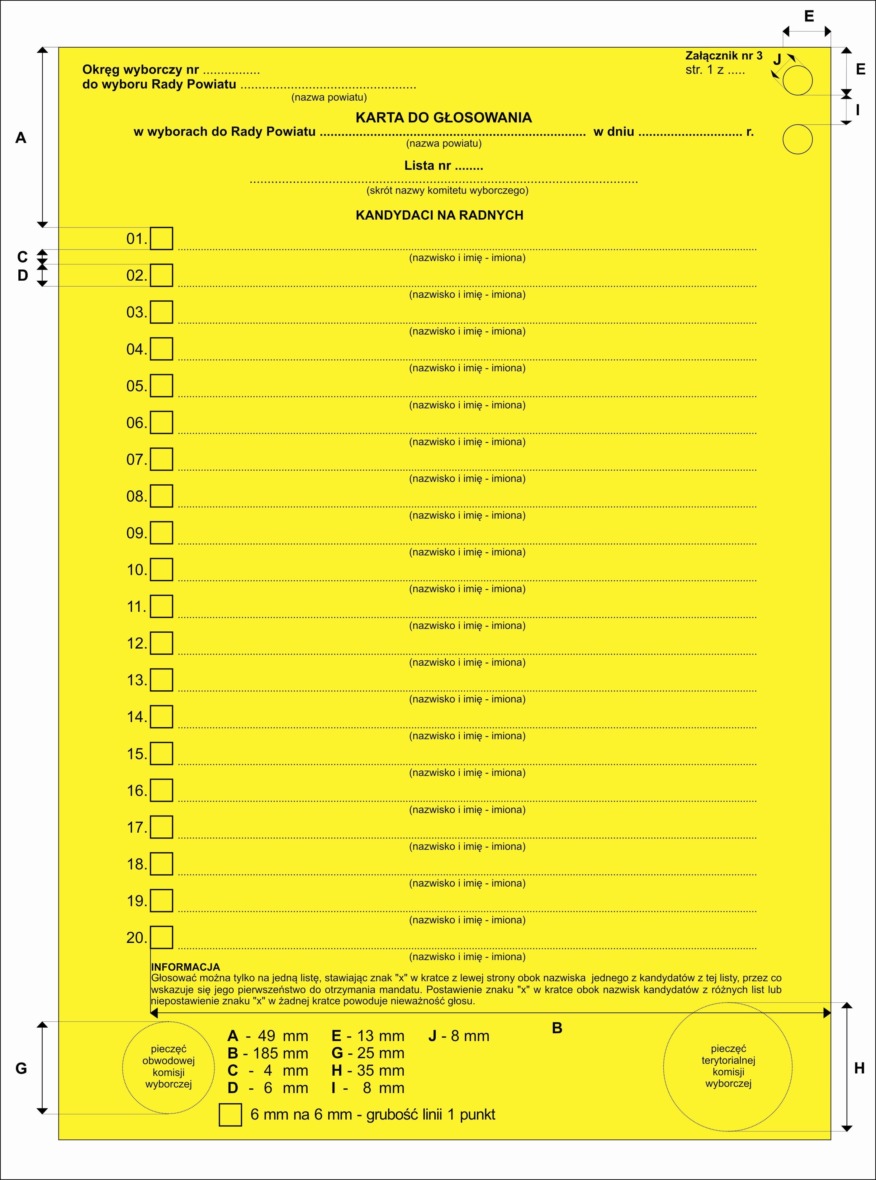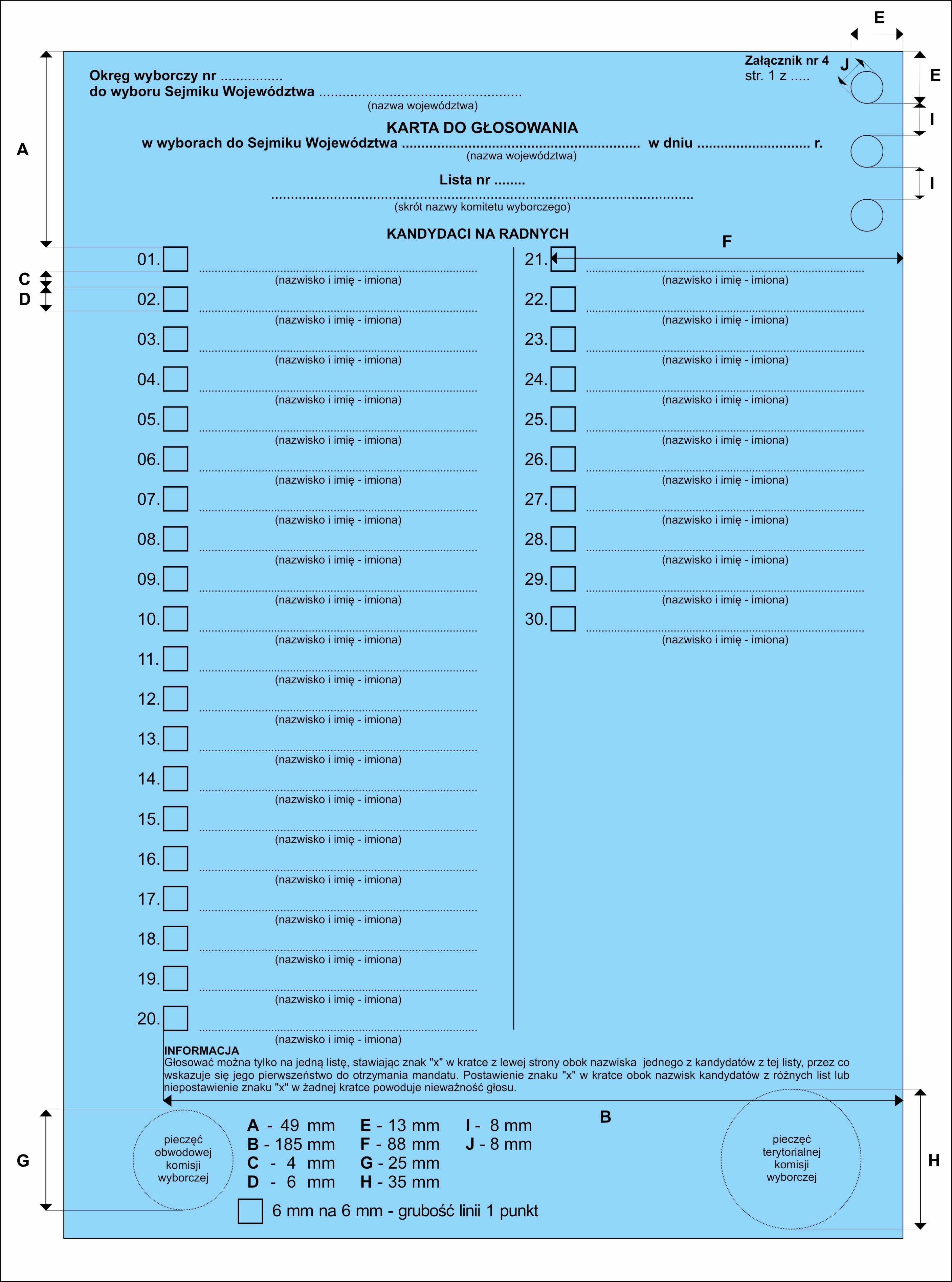 - Pośrodku pierwszej karty, w górnej jej części, umieszczony jest napis „KARTA DO GŁOSOWANIA w wyborach do …………………… (nazwa rady/sejmiku) w dniu ........................”.