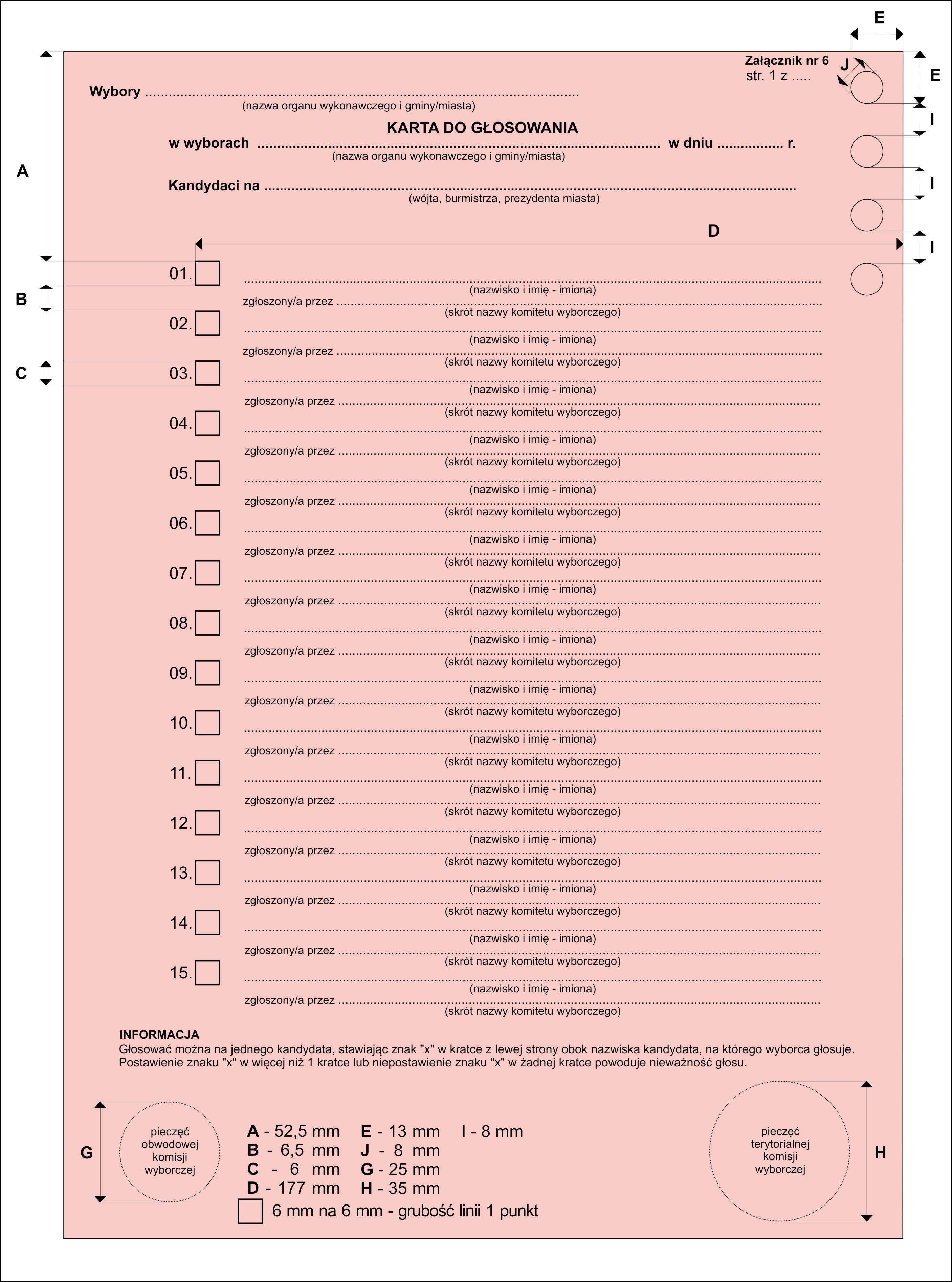 - Wzór oraz szczegółowe warunki techniczne karty do głosowania w wyborach wójta, burmistrza, prezydenta miasta, w których głosuje się na więcej niż jednego kandydata, określa załącznik Nr 6 do uchwały.