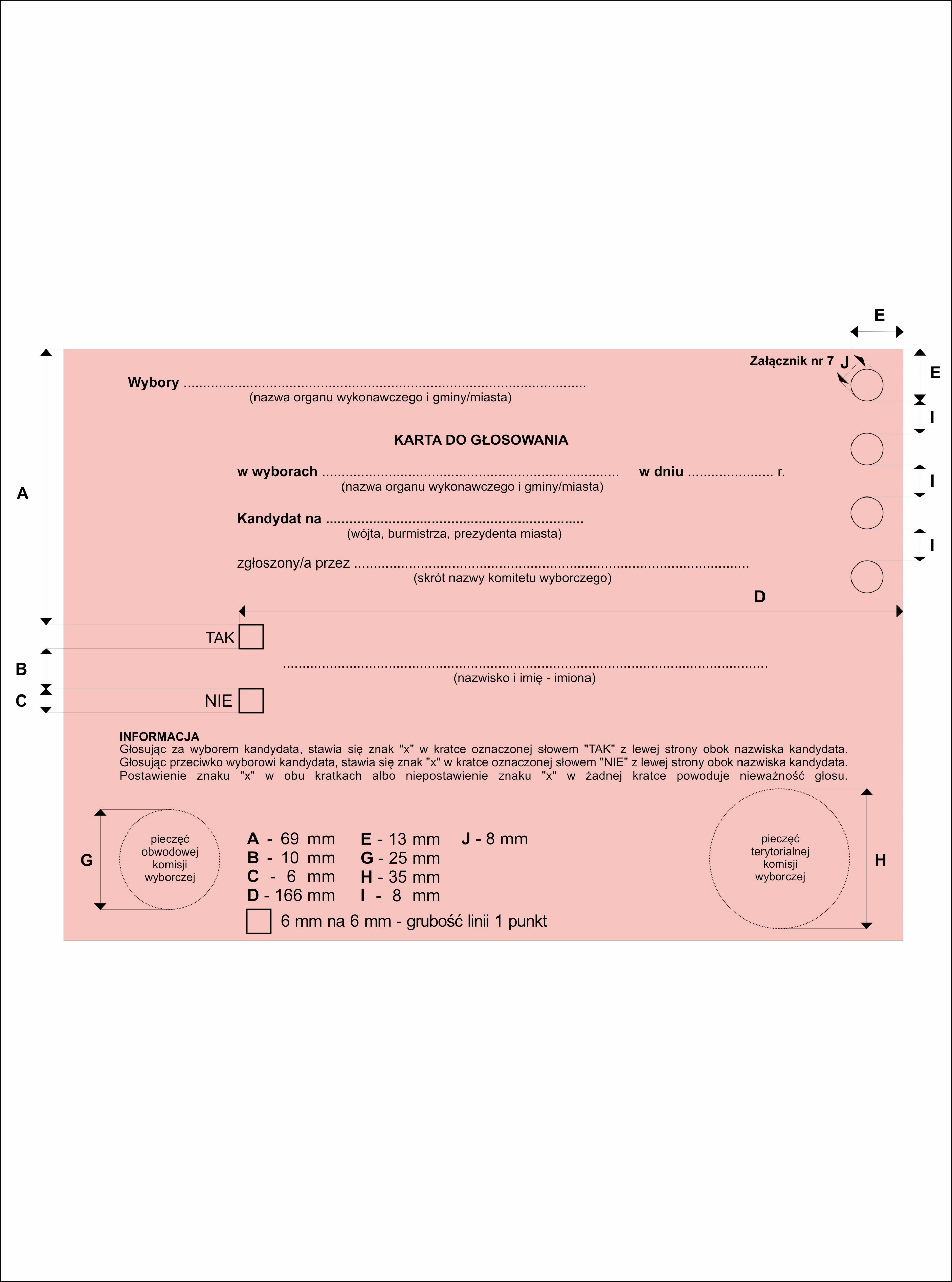 - Wzór oraz szczegółowe warunki techniczne karty do głosowania w wyborach wójta, burmistrza, prezydenta miasta, w których głosuje się na jednego kandydata, określa załącznik Nr 7 do uchwały.