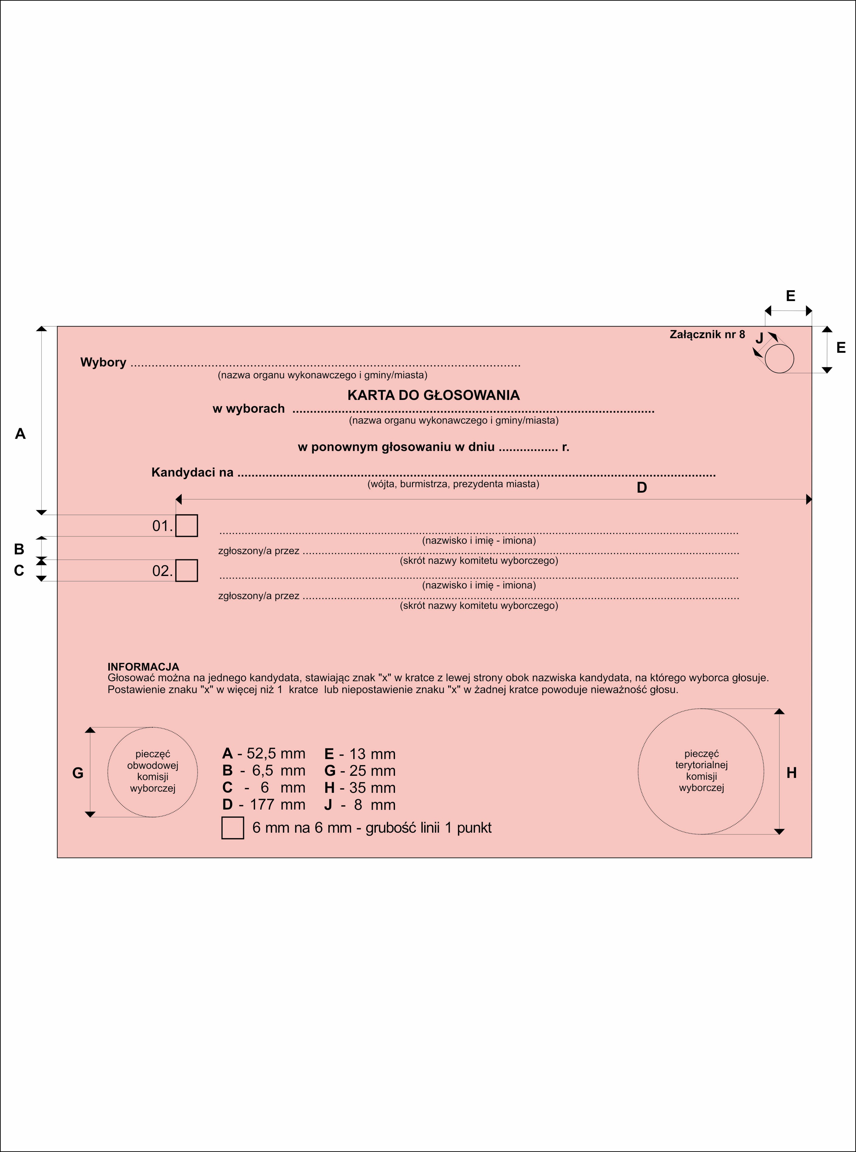 - Pośrodku karty, w górnej jej części, umieszczony jest napis „KARTA DO GŁOSOWANIA w wyborach ………………………… (nazwa organu wykonawczego i gminy) w dniu ........ r. Kandydat na …………………………… (wójta, burmistrza, prezydenta miasta) zgłoszony przez ………………………… (skrót nazwy komitetu wyborczego)”.