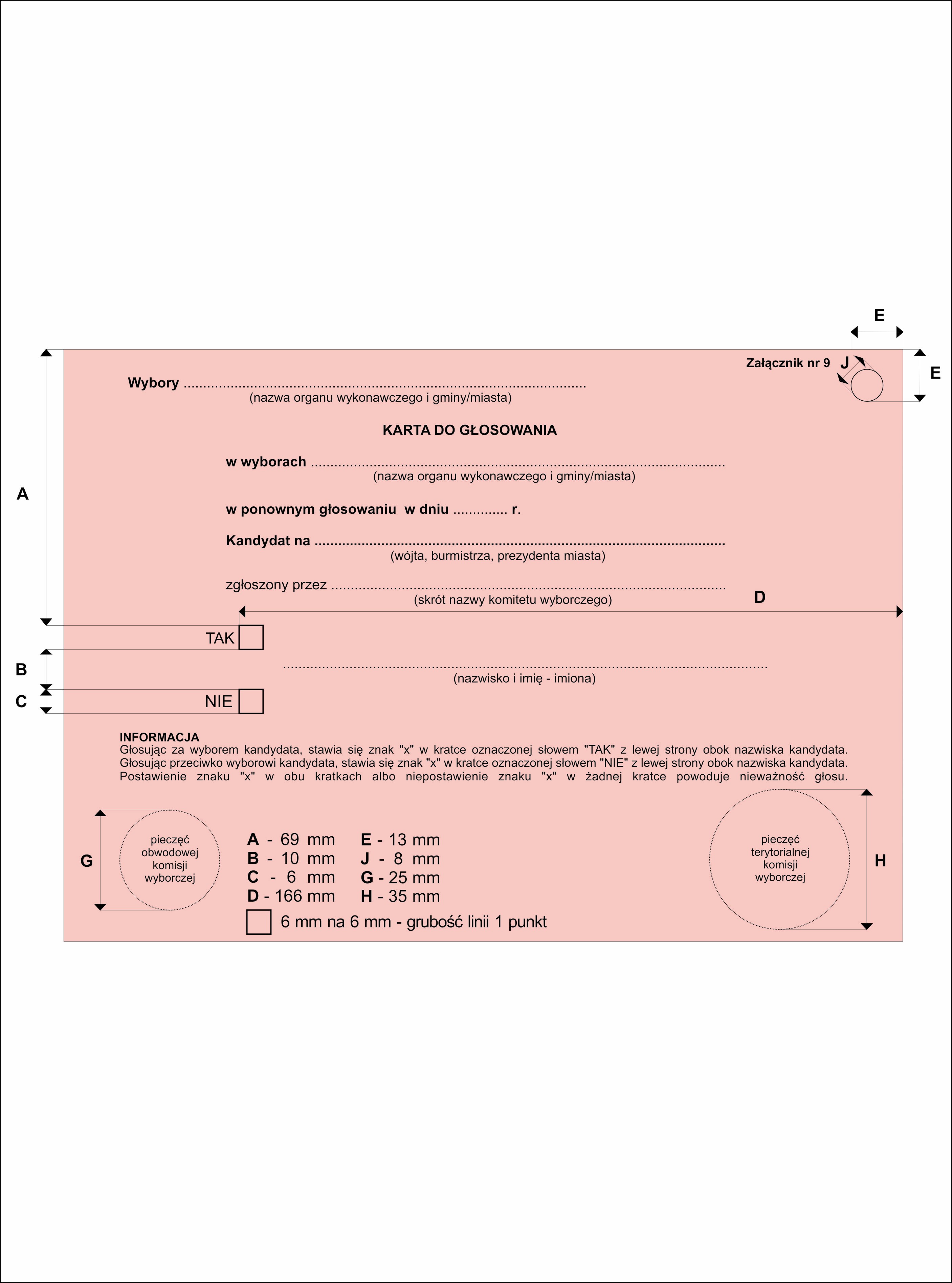 5. Wzór oraz szczegółowe warunki techniczne karty do głosowania w głosowaniu ponownym w wyborach wójta, burmistrza, prezydenta miasta, w których głosuje się na jednego kandydata, określa załącznik Nr 9 do uchwały.