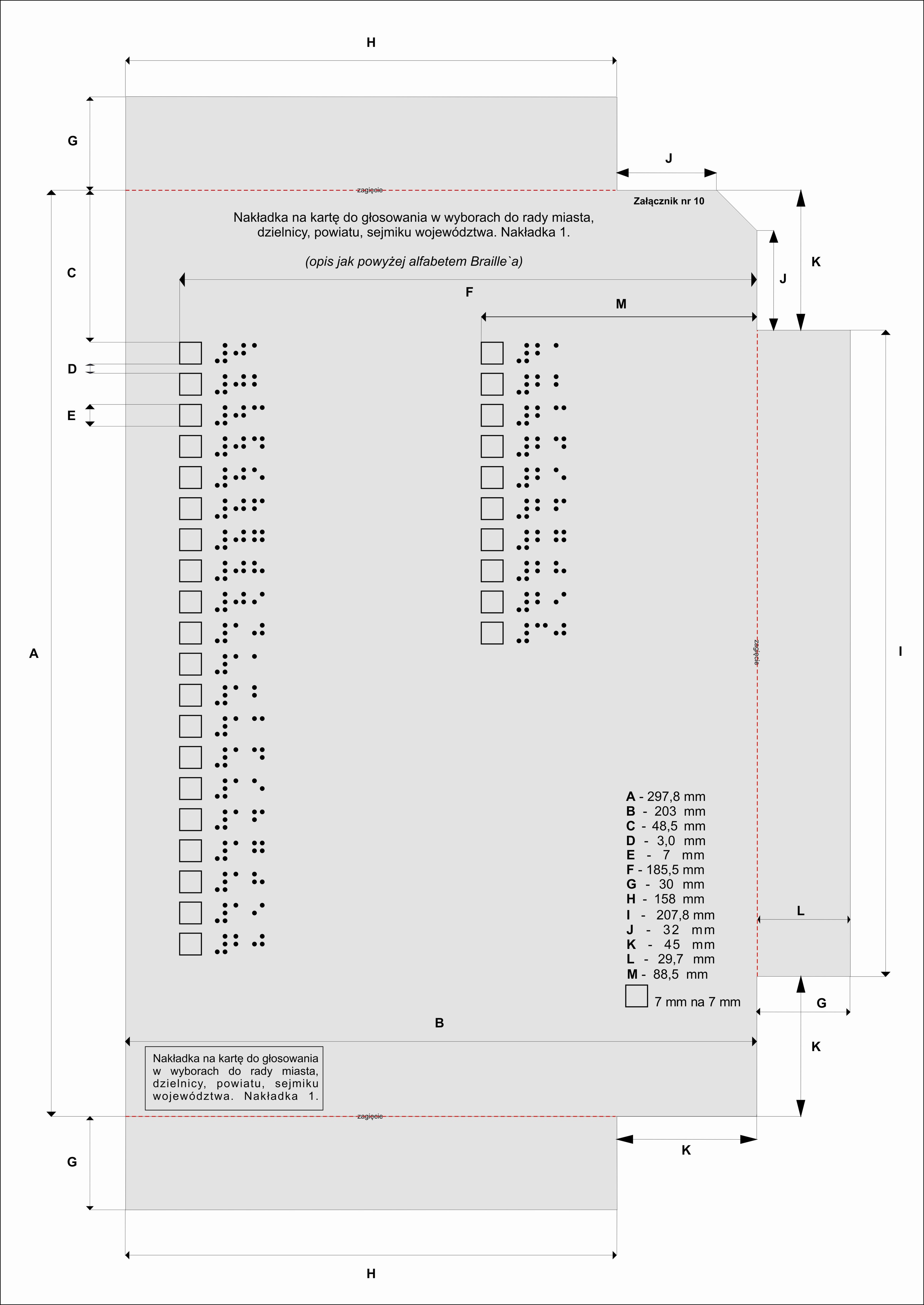 - Pośrodku nakładki na kartę, w górnej jej części, umieszczony jest napis zapisany alfabetem Braille’a w standardzie Marburg Medium „Nakładka na kartę do głosowania w wyborach do rady miasta, dzielnicy, powiatu, sejmiku województwa. Nakładka 1.”