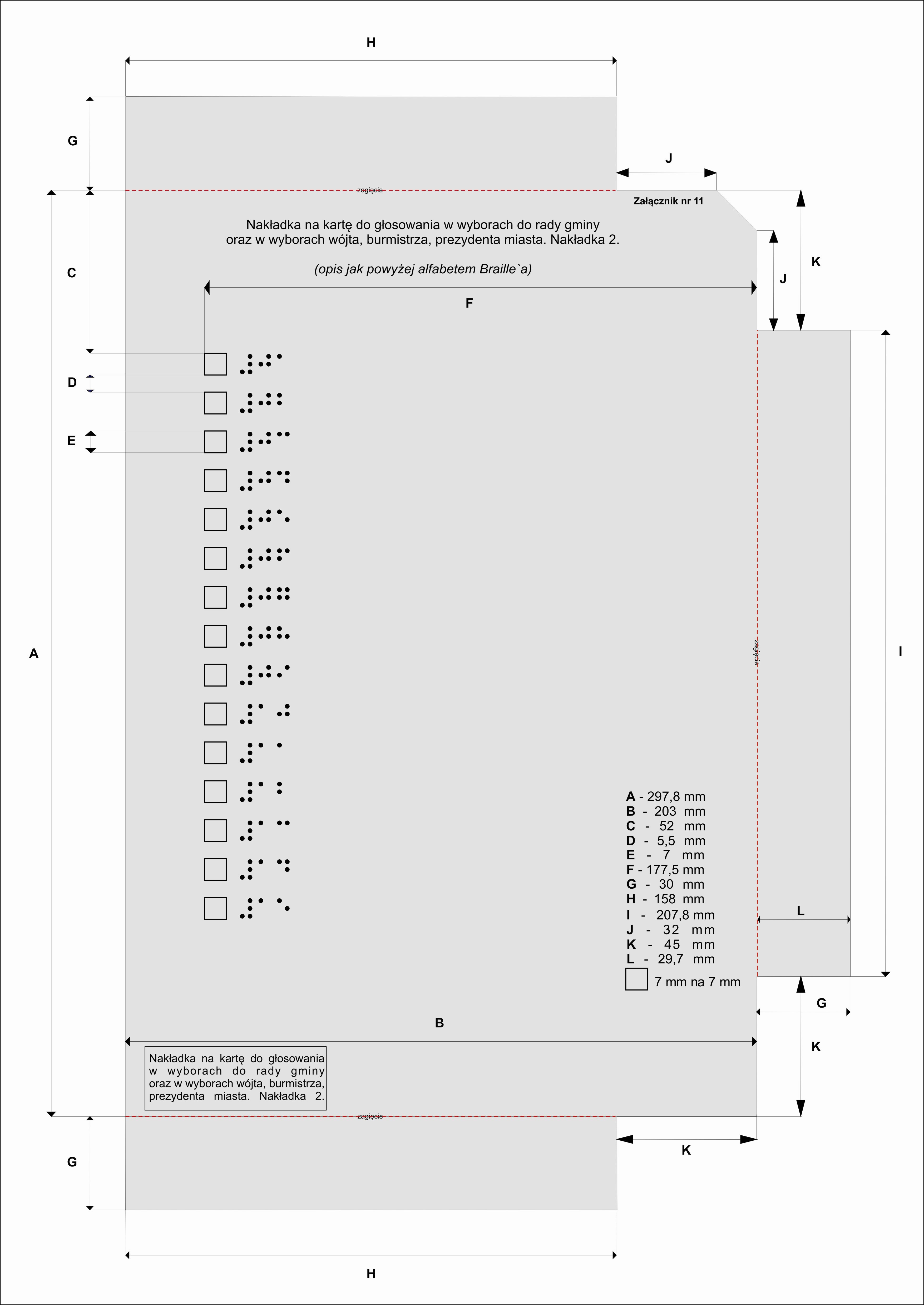 - Pośrodku nakładki na kartę, w górnej jej części, umieszczony jest napis zapisany alfabetem Braille’a w standardzie Marburg Medium „Nakładka na kartę do głosowania w wyborach do rady gminy oraz w wyborach wójta, burmistrza, prezydenta miasta. Nakładka 2.”.