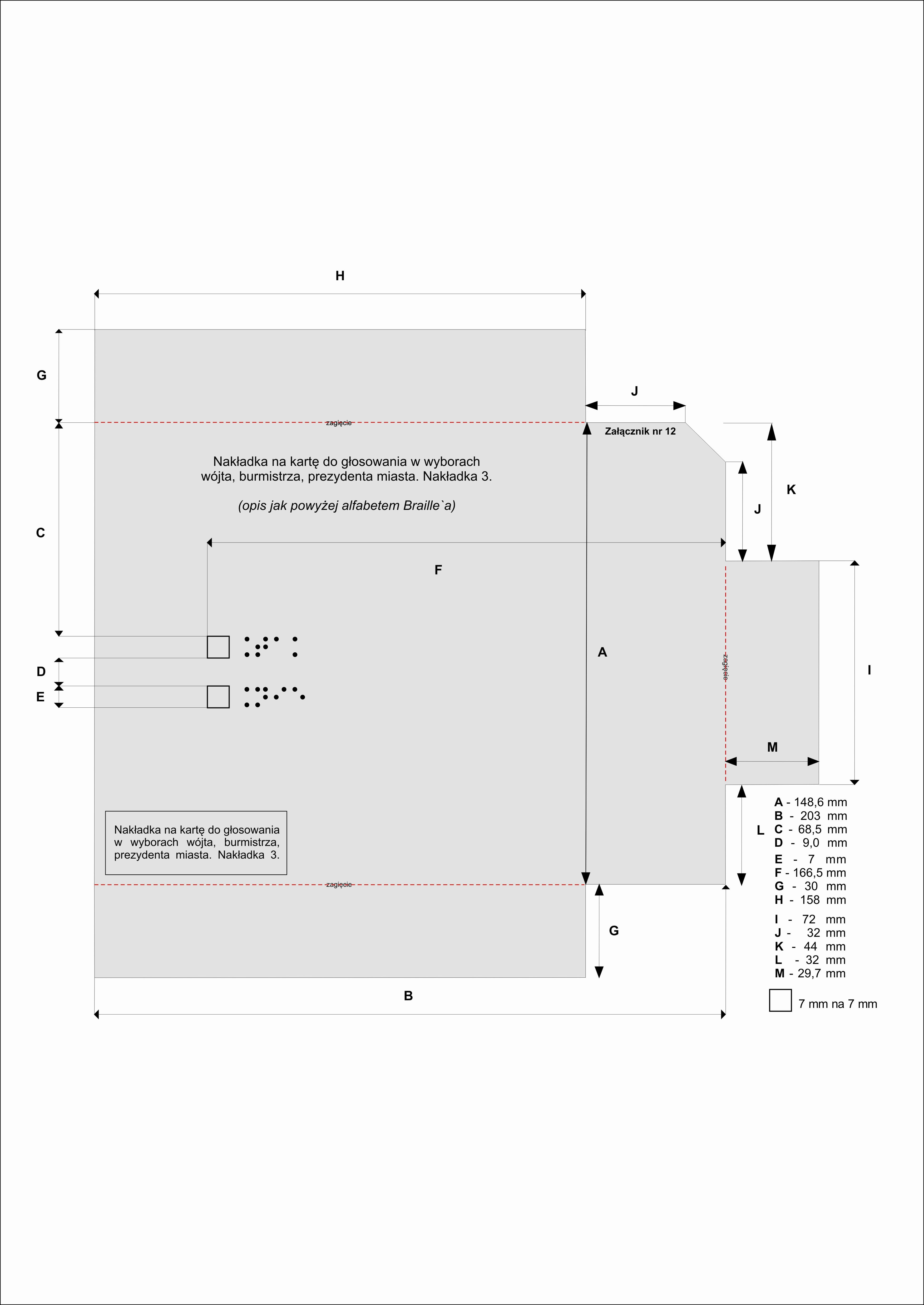 - Pośrodku nakładki na kartę, w górnej jej części, umieszczony jest napis zapisany alfabetem Braille’a w standardzie Marburg Medium „Nakładka na kartę do głosowania w wyborach wójta, burmistrza, prezydenta miasta. Nakładka 3.”.