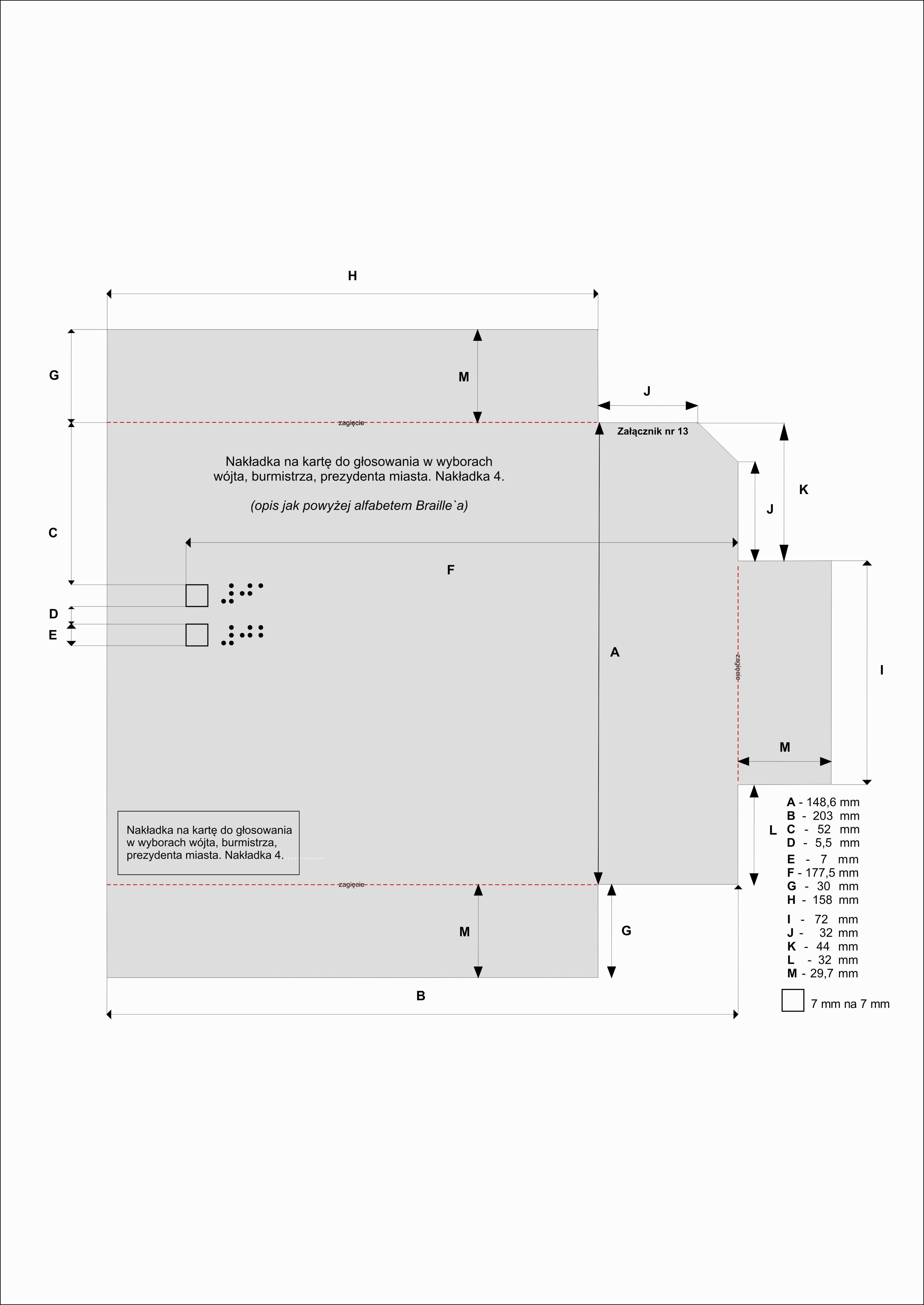 - Pośrodku nakładki na kartę, w górnej jej części, umieszczony jest napis zapisany alfabetem Braille’a w standardzie Marburg Medium „Nakładka na kartę do głosowania w wyborach wójta, burmistrza, prezydenta miasta. Nakładka 4.”.