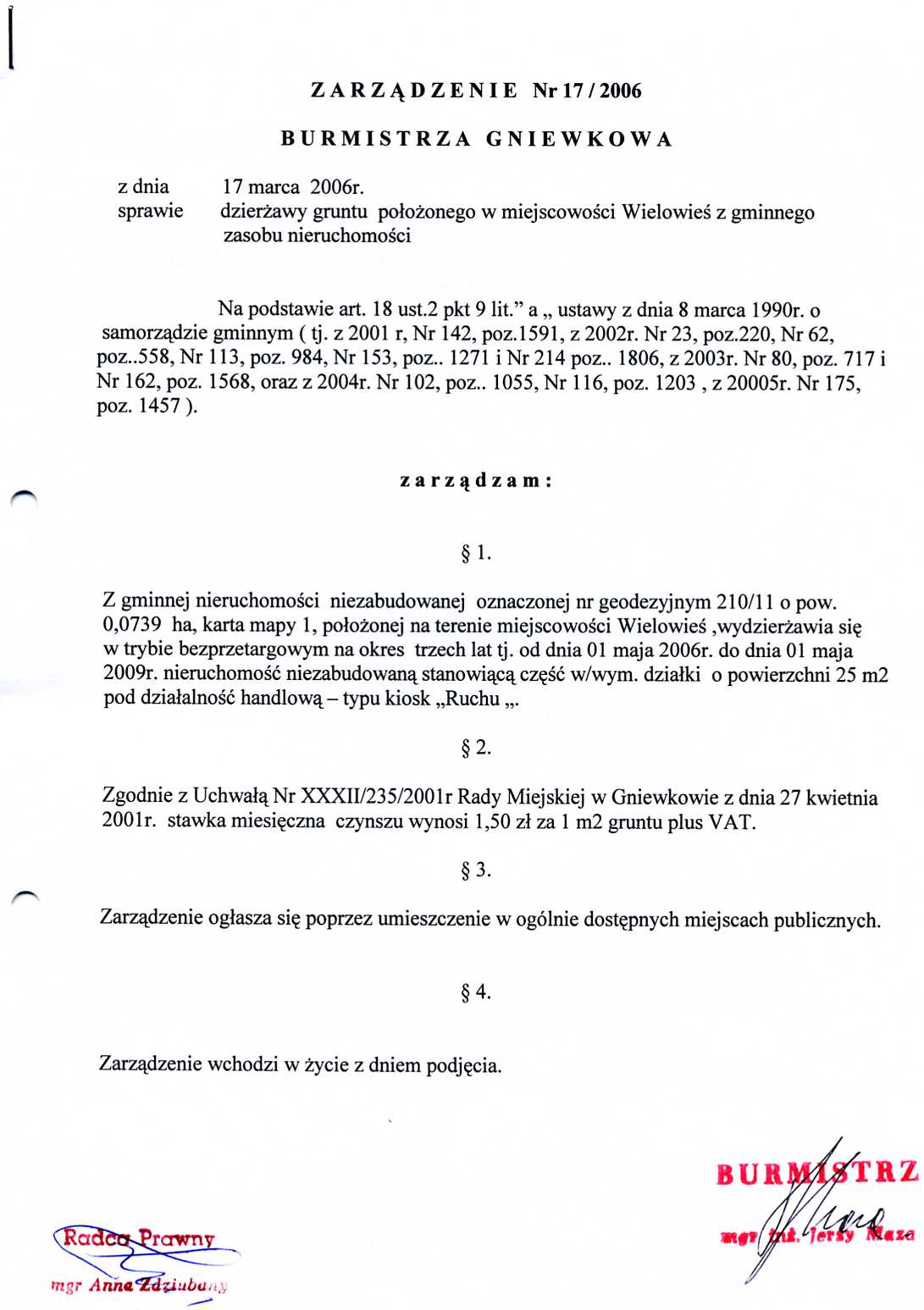 • Zarządzenie Nr 17/2006 Burmistrza Gniewkowa z dnia 17 marca 2006r. w/s dzierżawy...