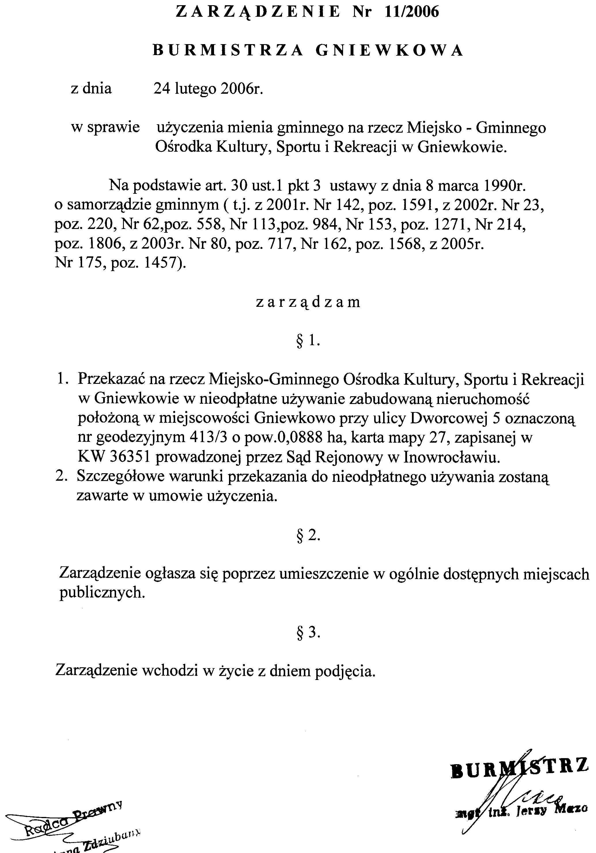 Zarządzenie Burmistrza Gniewkowa Nr 11/2006 z dnia 24.02.2006r. w/s użyczenia mienia gminnego na rzecz Miejsko-Gminnego Ośrodka Kultury ,Sportu i Rekreacji w Gniewkowie