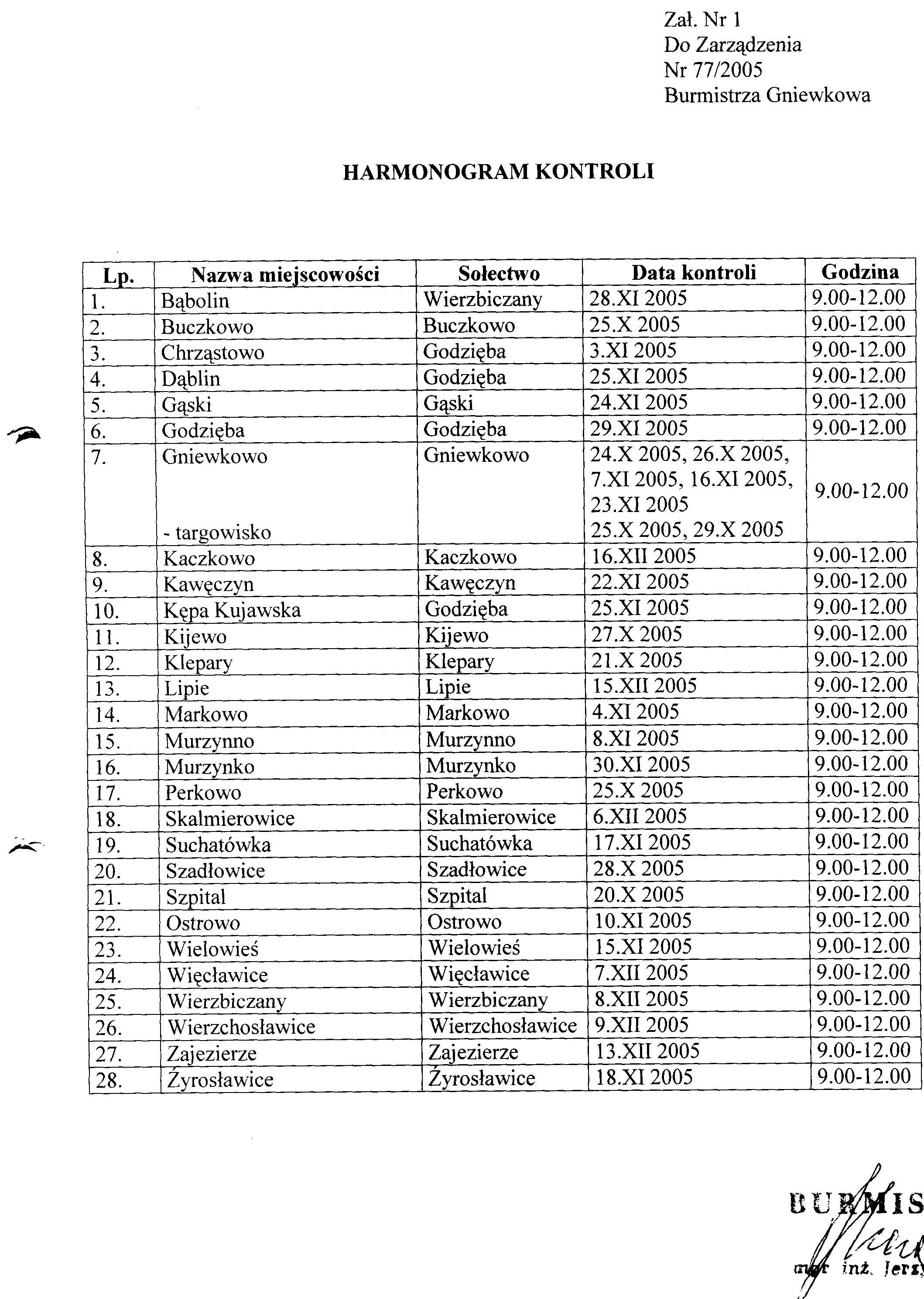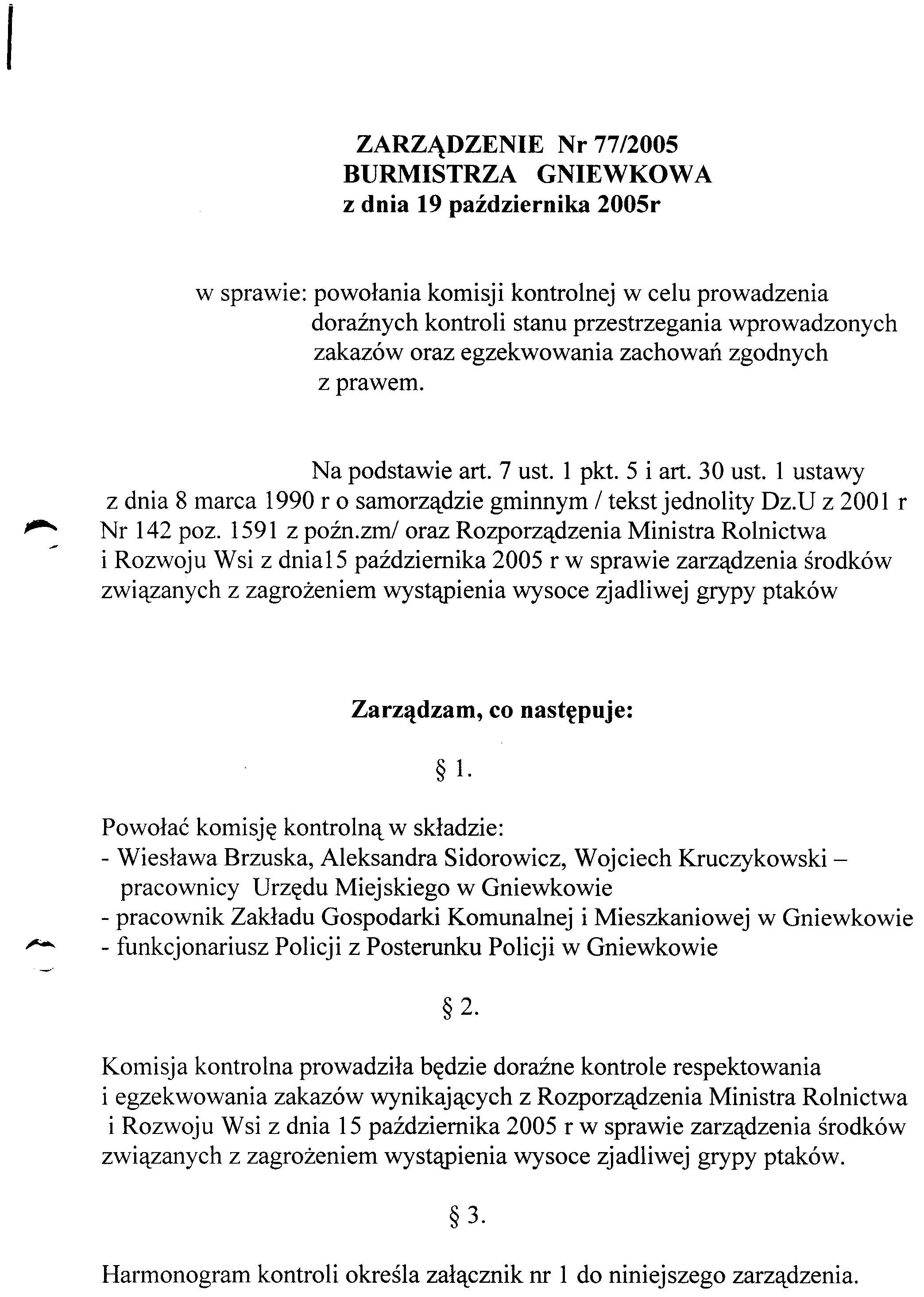 Zarządzenie Burmistrza Gniewkowa Nr 77/2005 z dn. 19.10.2005r. w/s powołania komisji kontrolnej w celu prowadzenia doraźnych kontroli stanu przestrzegania wprowadzonych zakazów oraz egzekwowania zachowań zgodnych z prawem