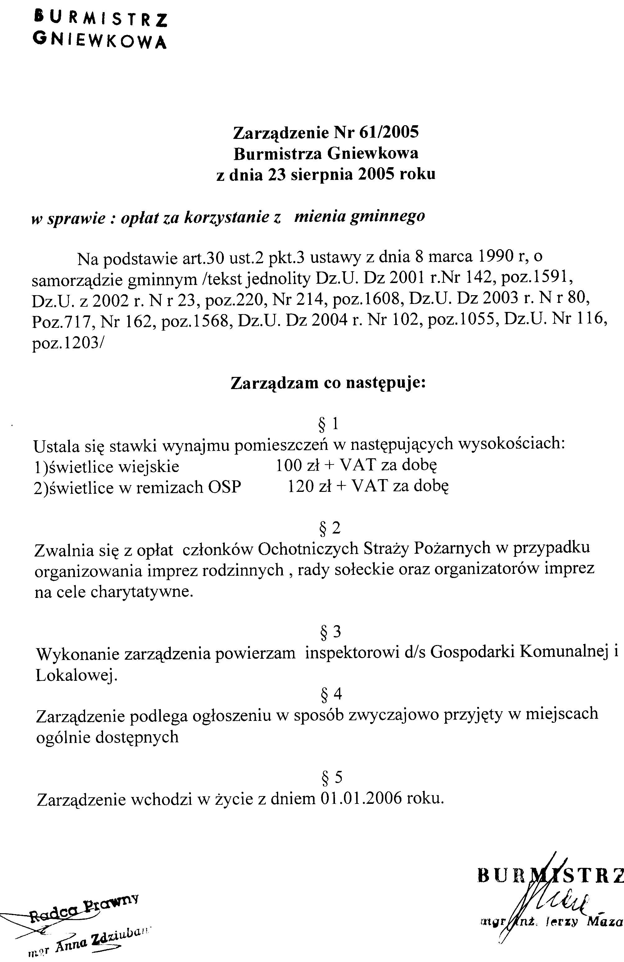 Zarządzenie Burmistrza Gniewkowa Nr 61/2005 z dnia 23 sierpnia 2005r. w sprawie opłat za korzystanie z mienia gminnego