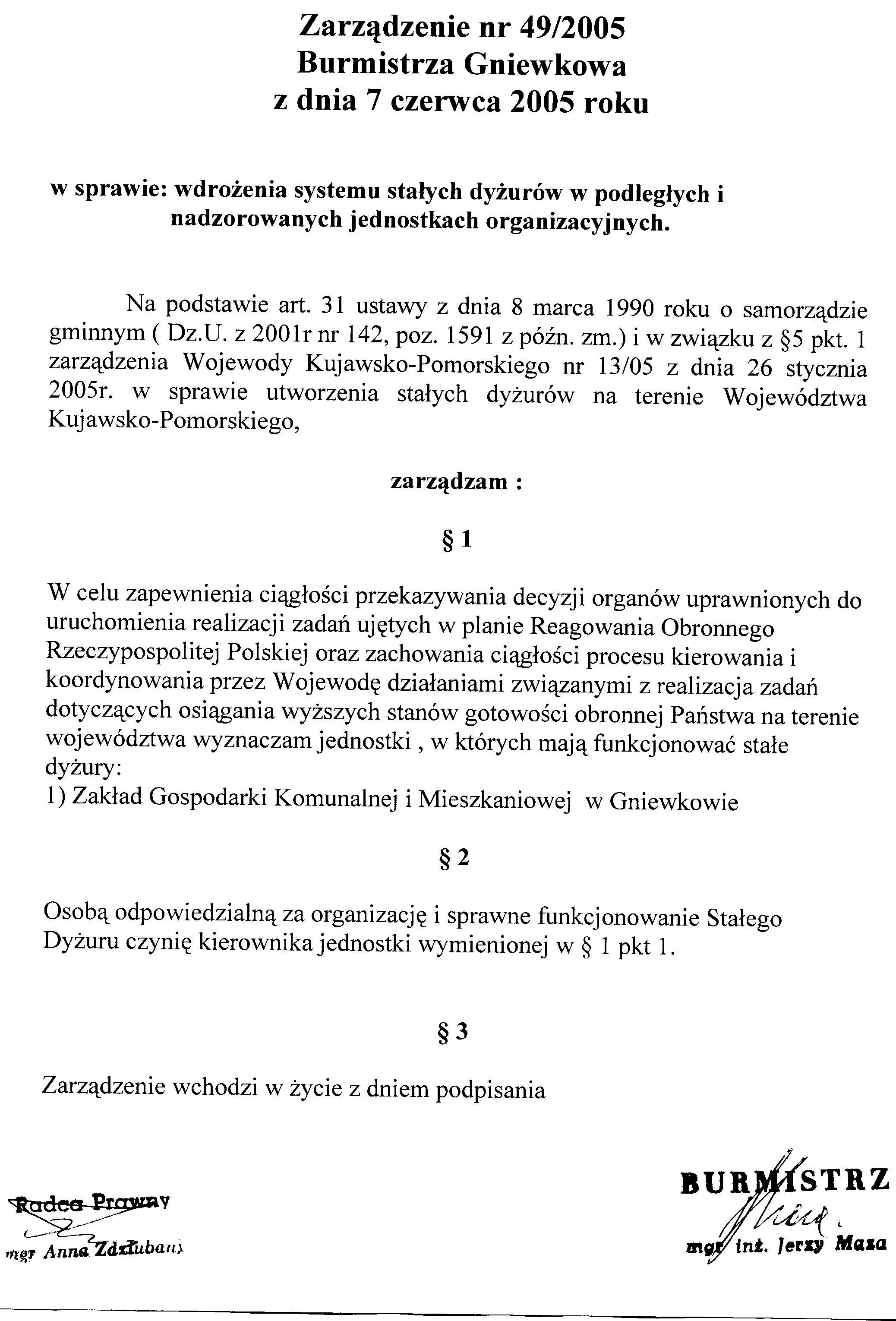 Zarządzenie Burmistrza Gniewkowa Nr 49/2005 z dnia 7 czerwca 2005r. w/s wdrożenia systemu stałych dyżurów w podległych i nadzorowanych jednostkach organizacyjnych .