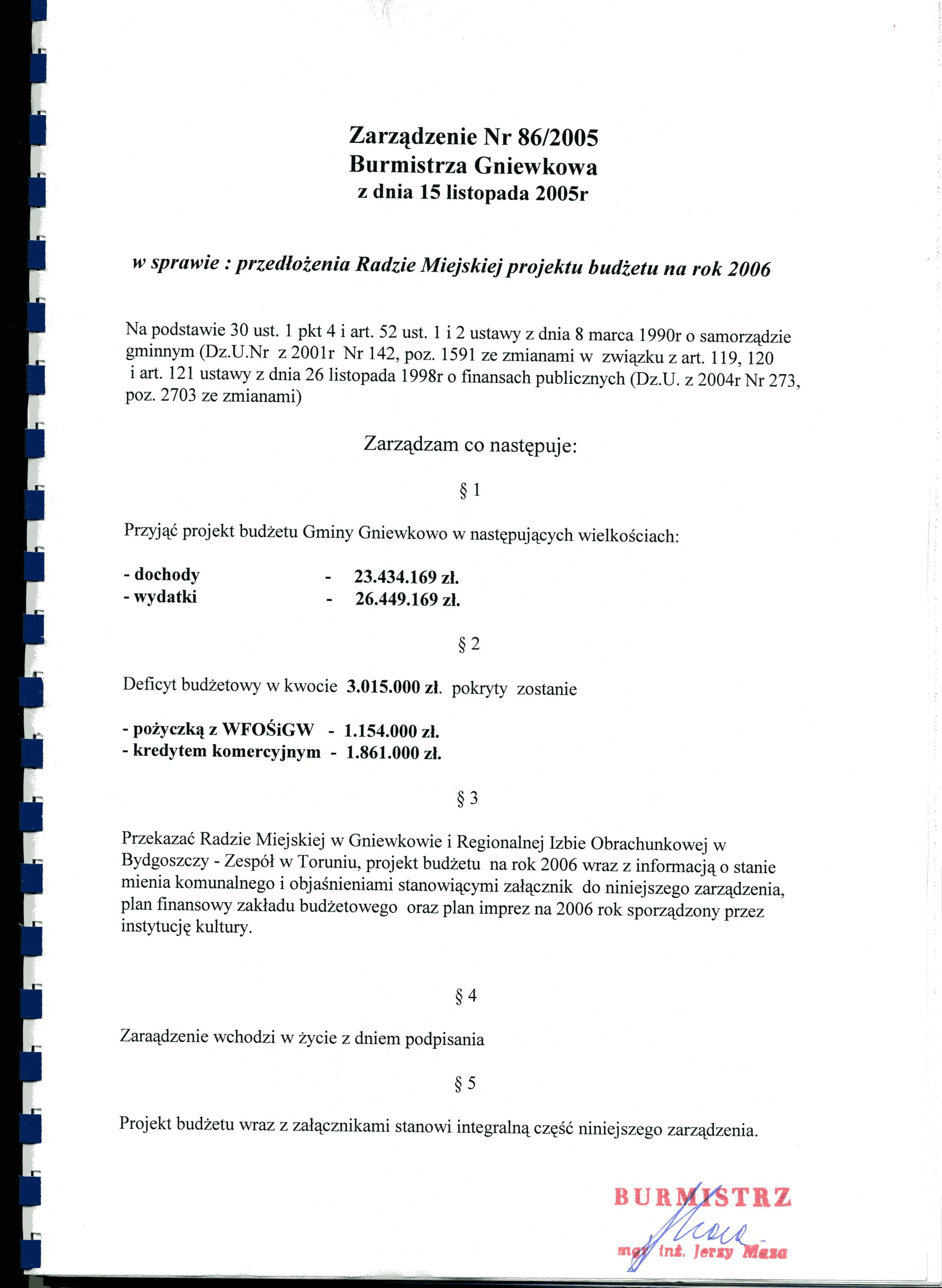 Zarządzenie Burmistrza Gniewkowa Nr 86/2005 z dn. 15.11.05r. w/s przedłożenia Radzie Miejskiej projektu budżetu na rok 2006