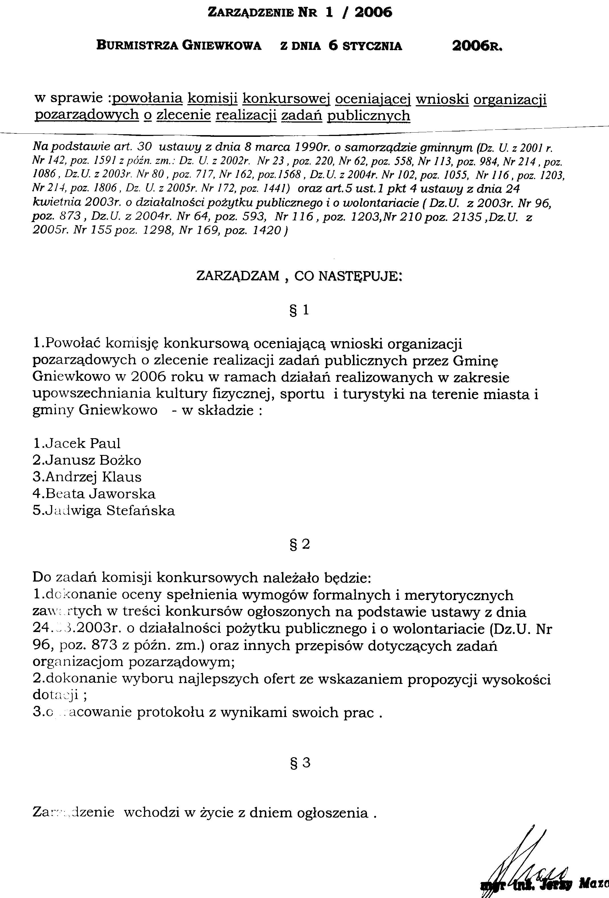 Zarządzenie Nr 1/2006 Burmistrza Gniewkowa z dnia 06.01.2006r. w/s powołania komisji konkursowej oceniającej wnioski organizacji pozarządowych o zlecenie realizacji zadań publicznych