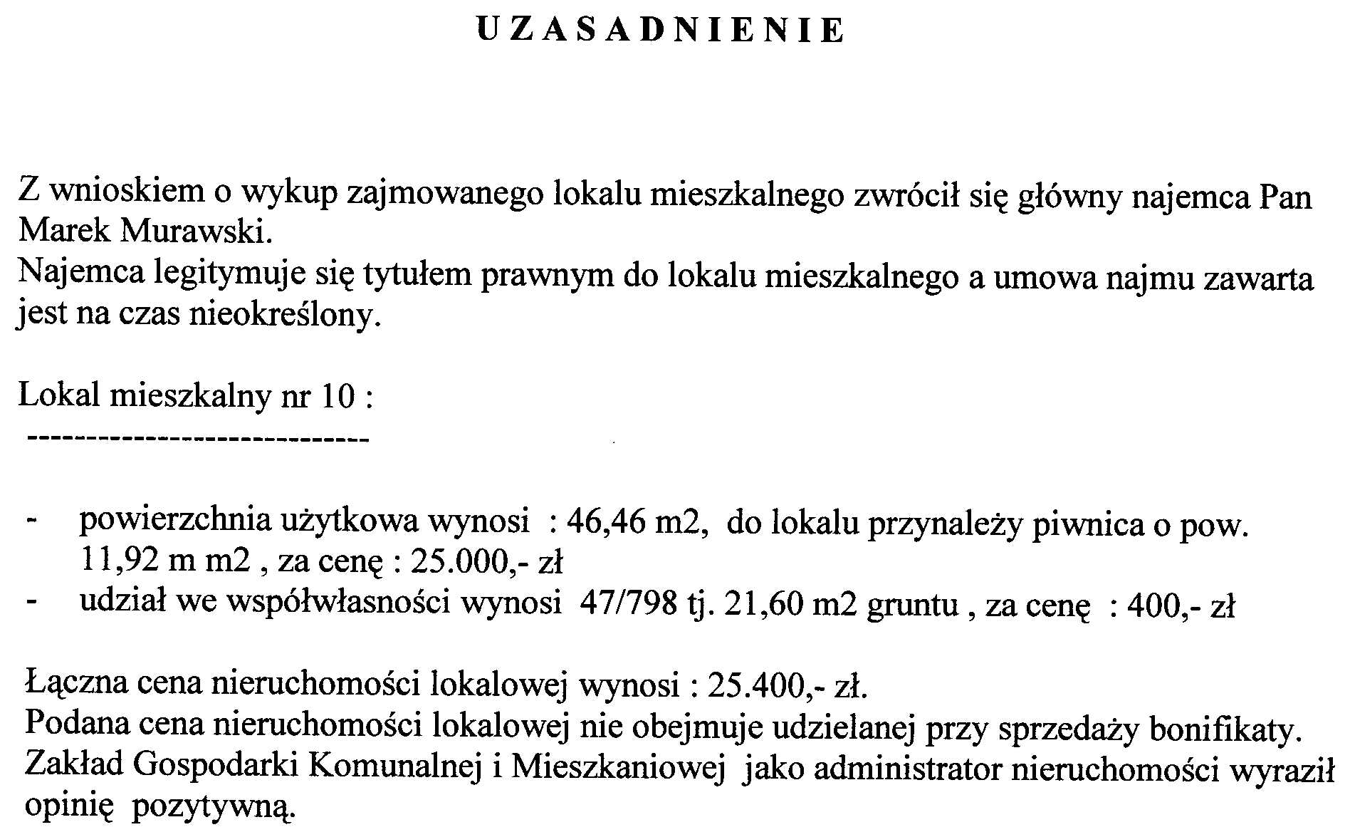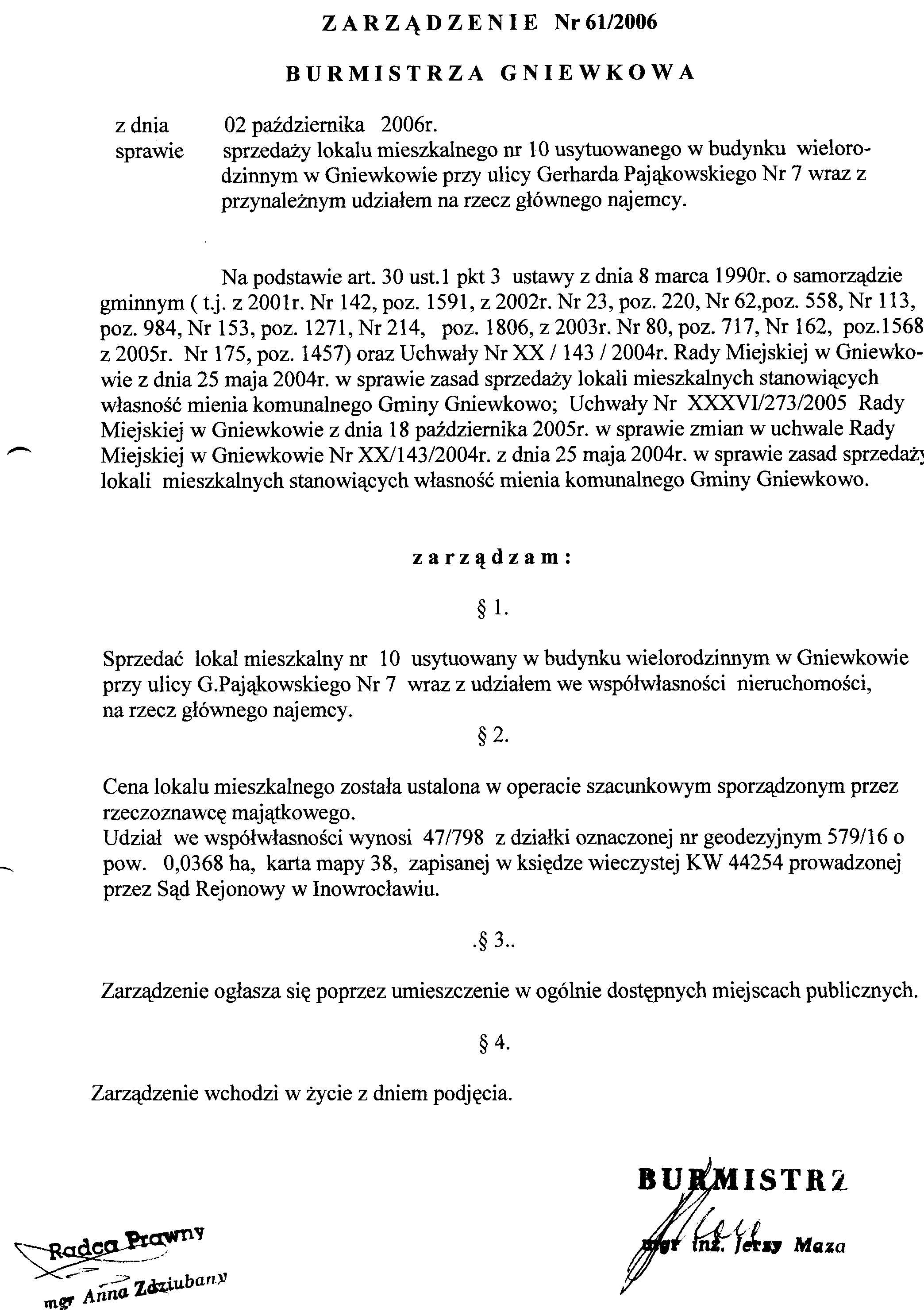 Zarządzenie Nr 61/2006 Burmistrza Gniewkowa z dnia 02.10.2006r. w/s sprzedaży lokalu mieszkalnego nr 10 usytuowanego w budynku wielorodzinnym w Gniewkowie przy ul.Gerharda Pająkowskiego Nr 7 wraz z przynależnym udziałem na rzecz głównego najemcy .