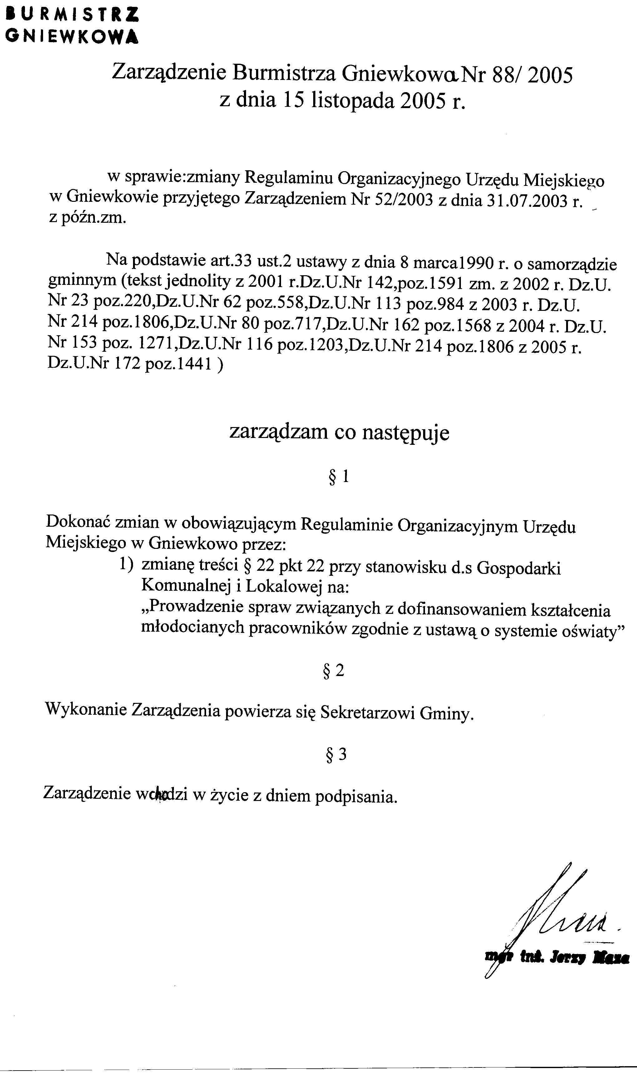 Zarządzenie Burmistrza Gniewkowa Nr 88/2005 z dn. 15.11.05r. w/s zmiany Regulaminu Organizacyjnego Urzędu Miejskiego w Gniewkowie przyjętego zarządzeniem Nr 52/2003 z dn. 31.07.2003r. z późn. zm.