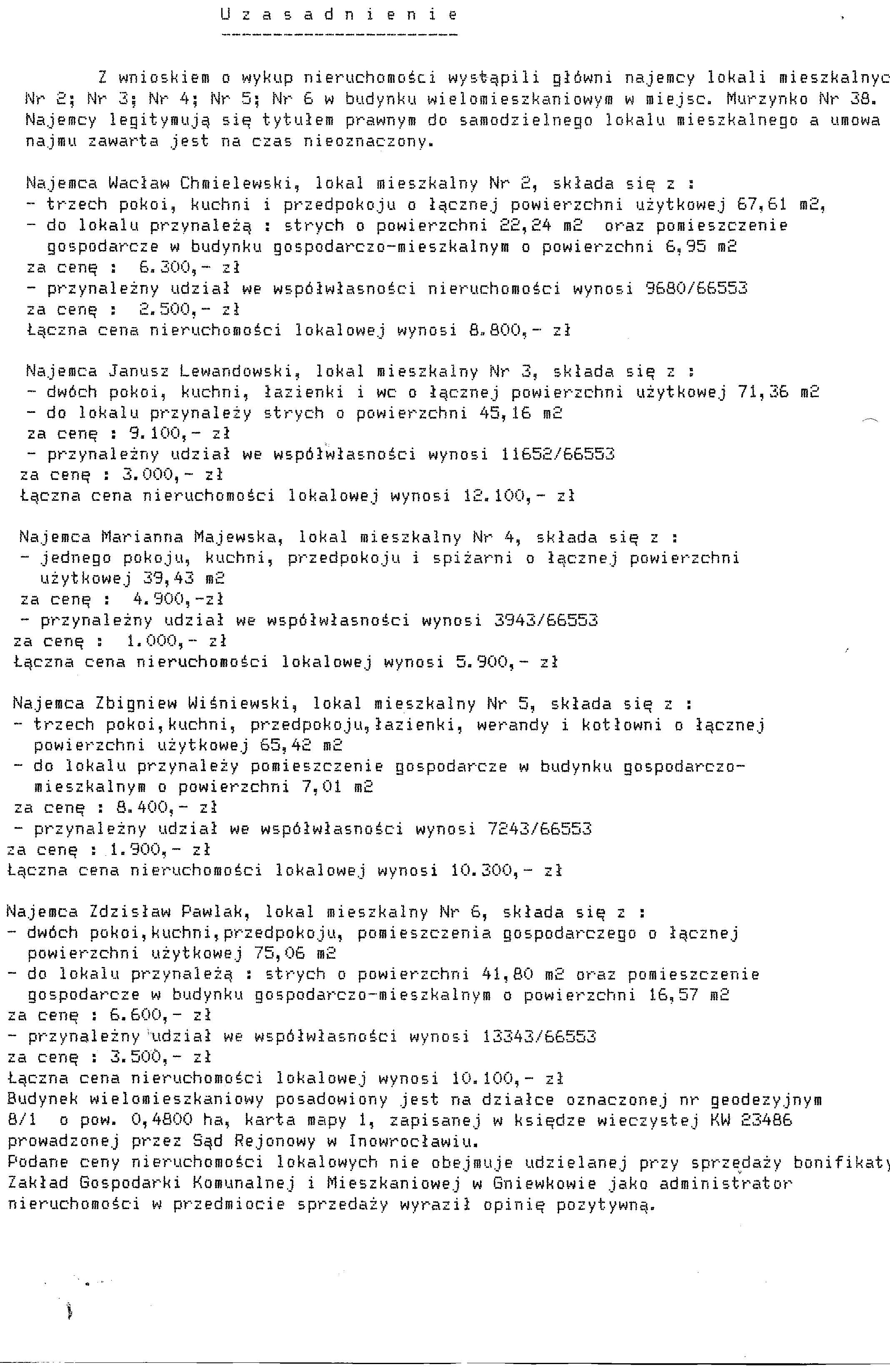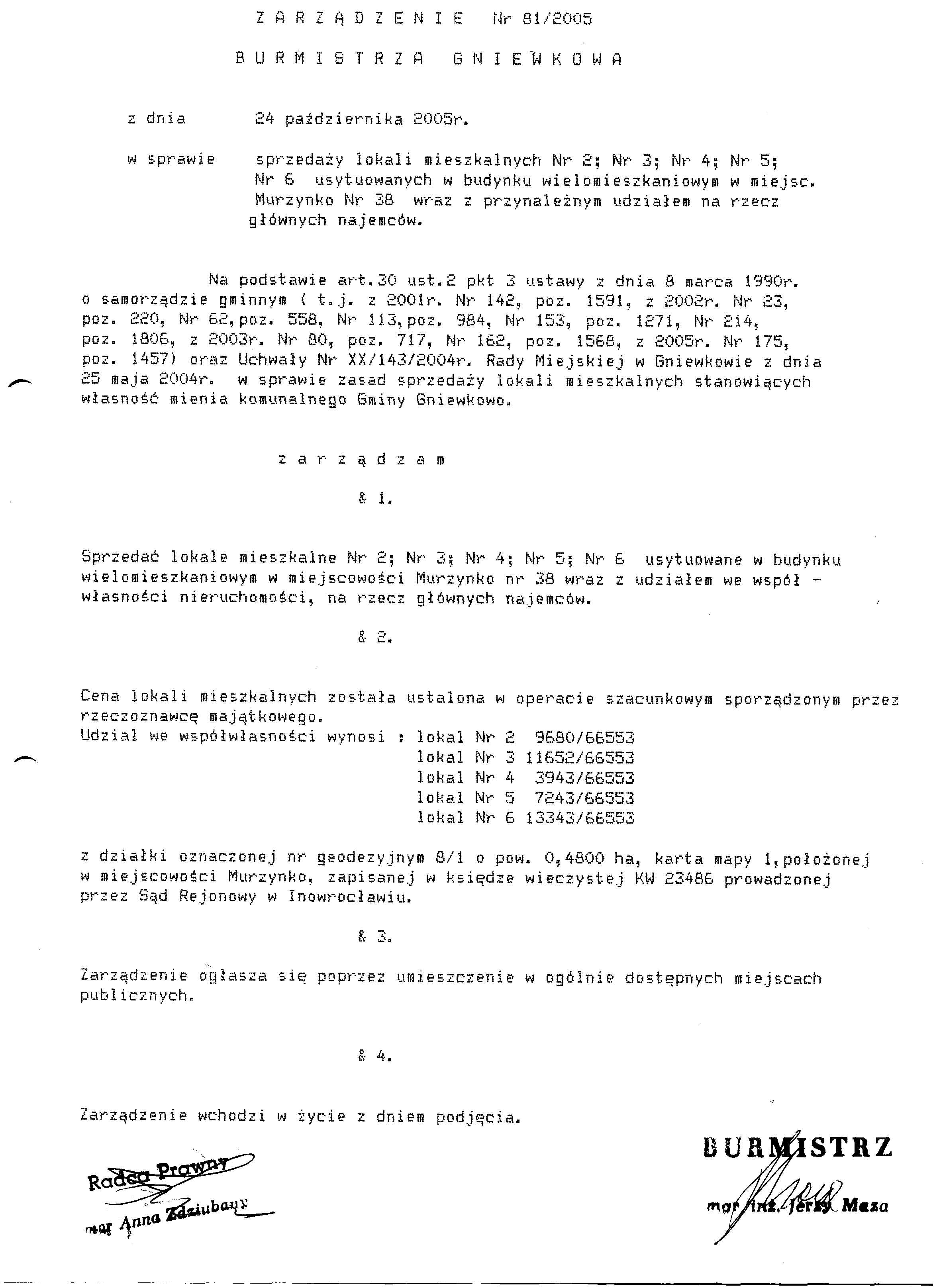 Zarządzenie Burmistrza Gniewkowa Nr 81/2005 z dn. 24.10.2005r. w/s sprzedaży lokali mieszkalnych Nr 2 , Nr 3 , Nr 4 , Nr 5 , Nr 6 usytuowanych w nudynku wielomieszkaniowym w miejscowości Murzynko Nr 38 wraz z przynależnym udziałem na rzecz głównych najemców