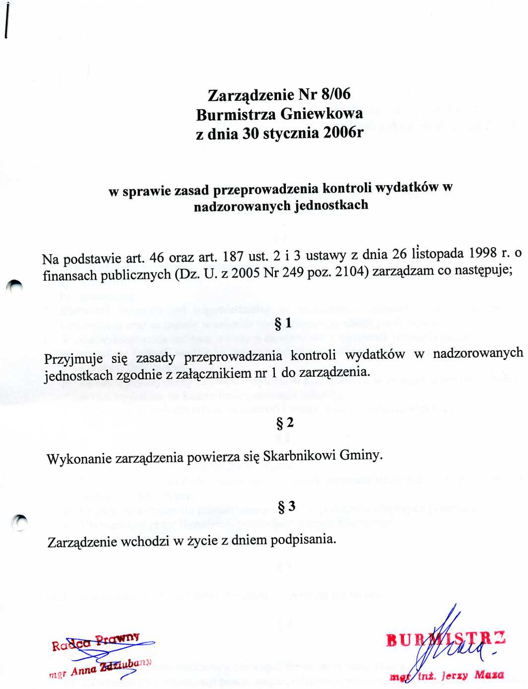 Zarządzenie Burmistrza Gniewkowa Nr 8/2006 z dnia 30.01.2006r. w/s zasad przeprowadzanaia kontroli wydatków w nadzorowanych jednostkach