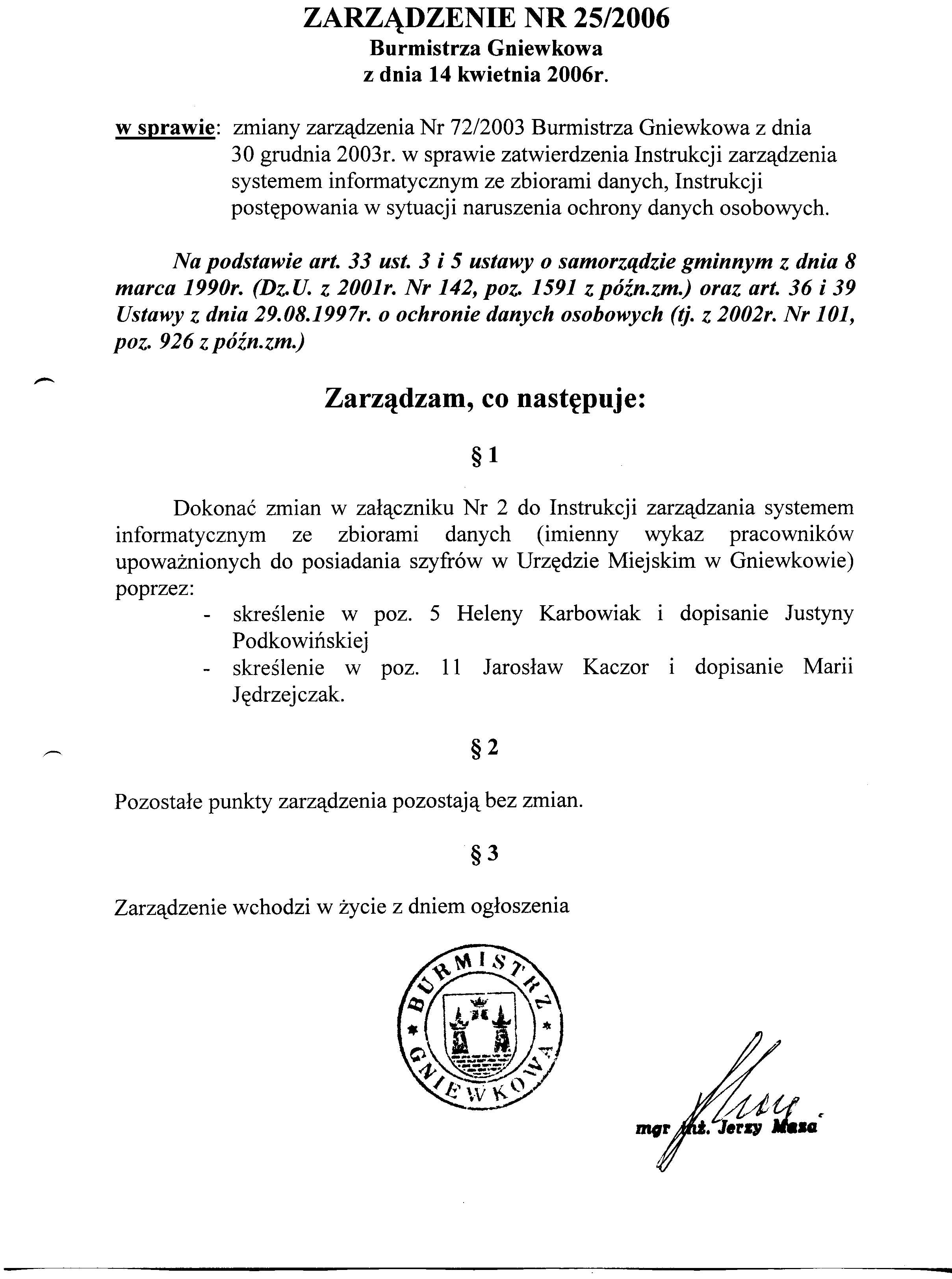 Zarządzenie Nr 25/2006 Burmistrza Gniewkowa z dnia 14 kwietnia 2006r. w/s zmiany zarządzenia Nr 72/2003 Burmistrza Gniewkowa z dn. 30.12.03r. w/s zatwierdzenia Instrukcji zarządzenia systemem informatycznym ze zbiorami danych , Instrukcji postępowania w sytuacji naruszenia ochrony danych osobowych