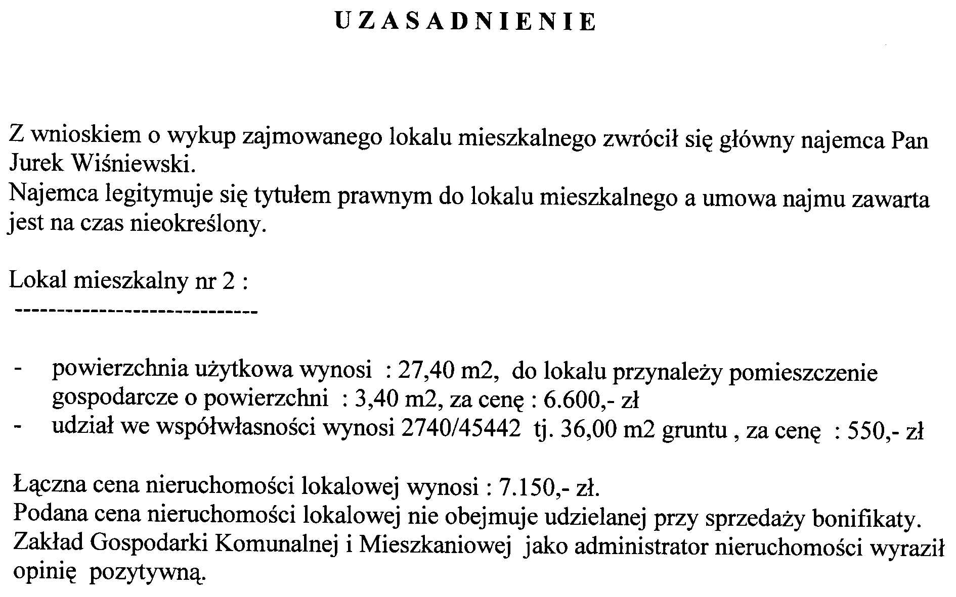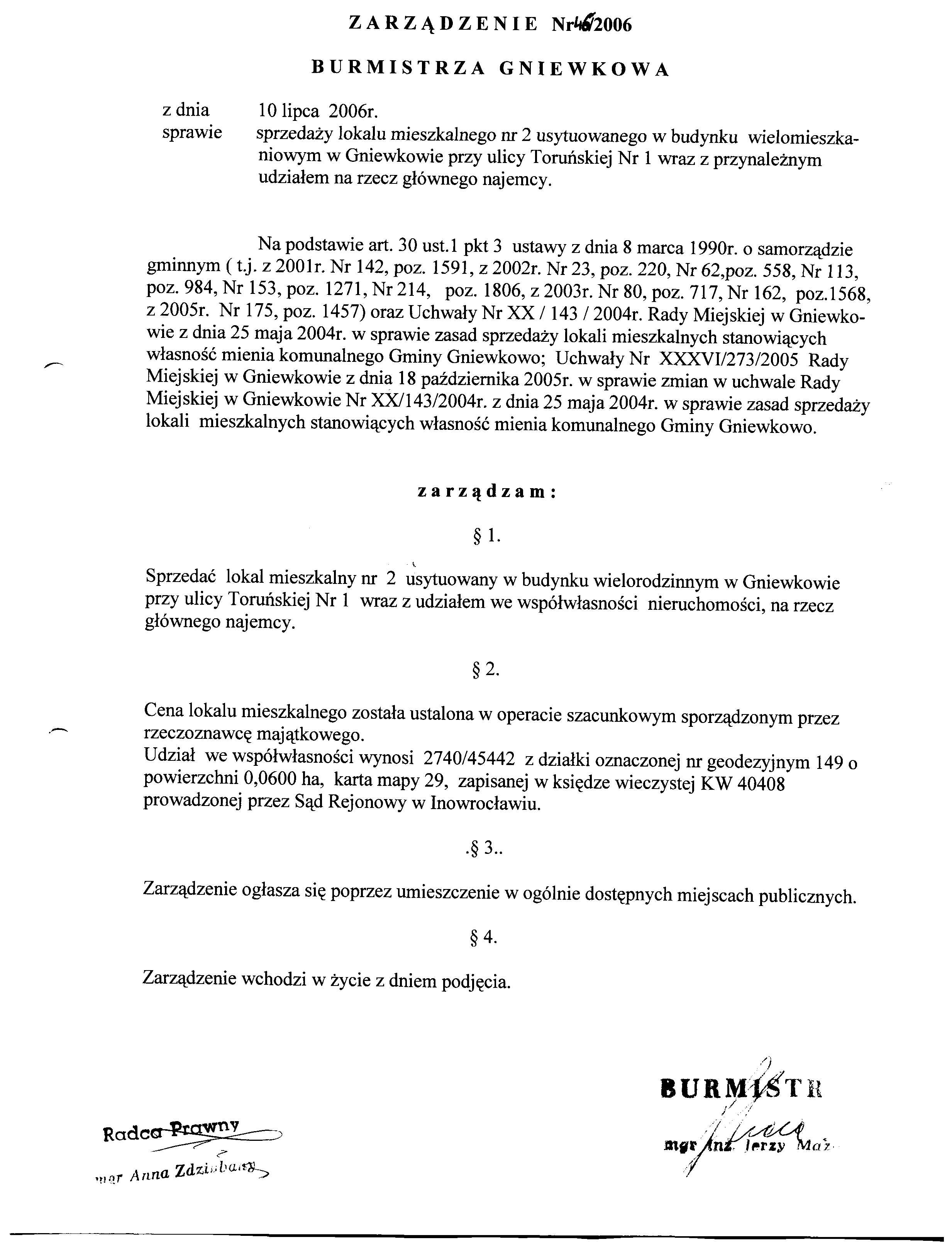 Zarządzenie Nr 46/2006 Burmistrza Gniewkowa z dnia 10.07.2006r. w/s sprzedazy lokalu mieszkalnego nr 2 usytuowanego w budynku wielomieszkaniowym w Gniewkowie przy ul.Toruńskiej Nr 1 wraz z przynależnym udziałem na rzecz głównego najemcy
