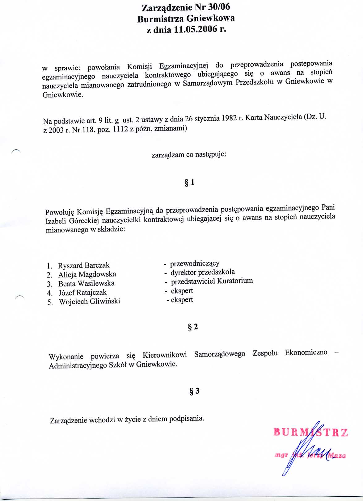 Zarządzenie Nr 30/2006 Burmistrza Gniewkowa z dnia 11.05.2006r. w/s powołania Komisji Egzaminacyjnej do przeprowadzenia postępowania egzaminacyjnego nauczyciela kontraktowego ubiegającego się o awans na stopień nauczyciela mianowanego zatrudnionego w Samorządowym Przedszkolu w Gniewkowie