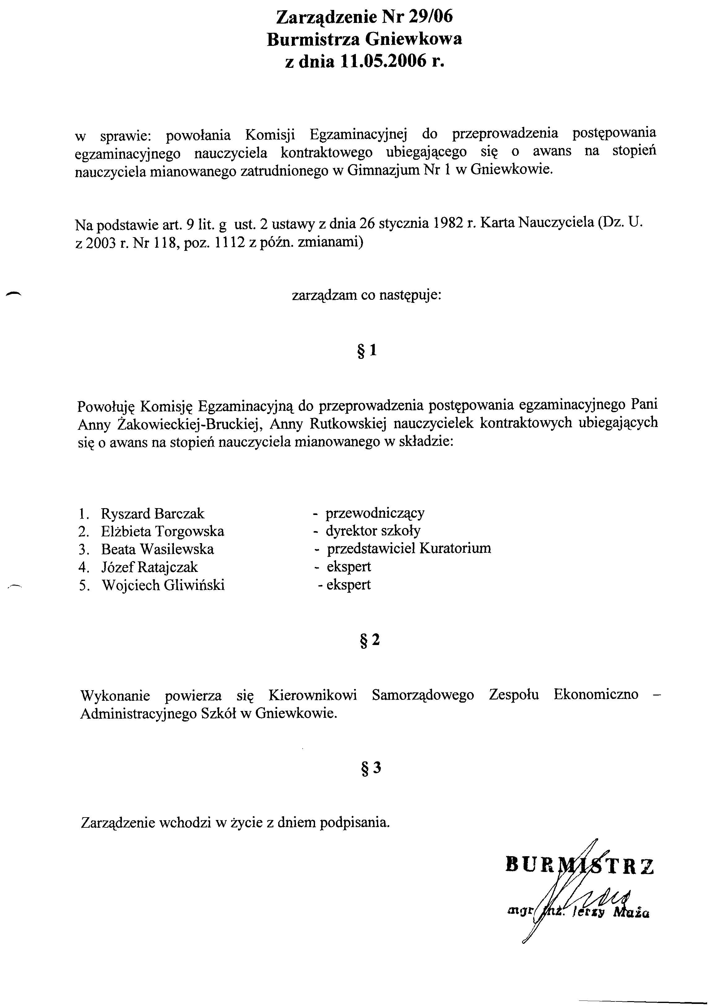 Zarządzenie Nr 29/2006 Burmistrza Gniewkowa z dnia 11.05.2006r. w/s powołania Komisji Egzaminacyjnej do przeprowadzenia postępowania egzaminacyjnego nauczyciela kontraktowego ubiegającego się o awans na stopień nauczyciela mianowanego zatrudnionego w Gimnazjum Nr 1 w Gniewkowie