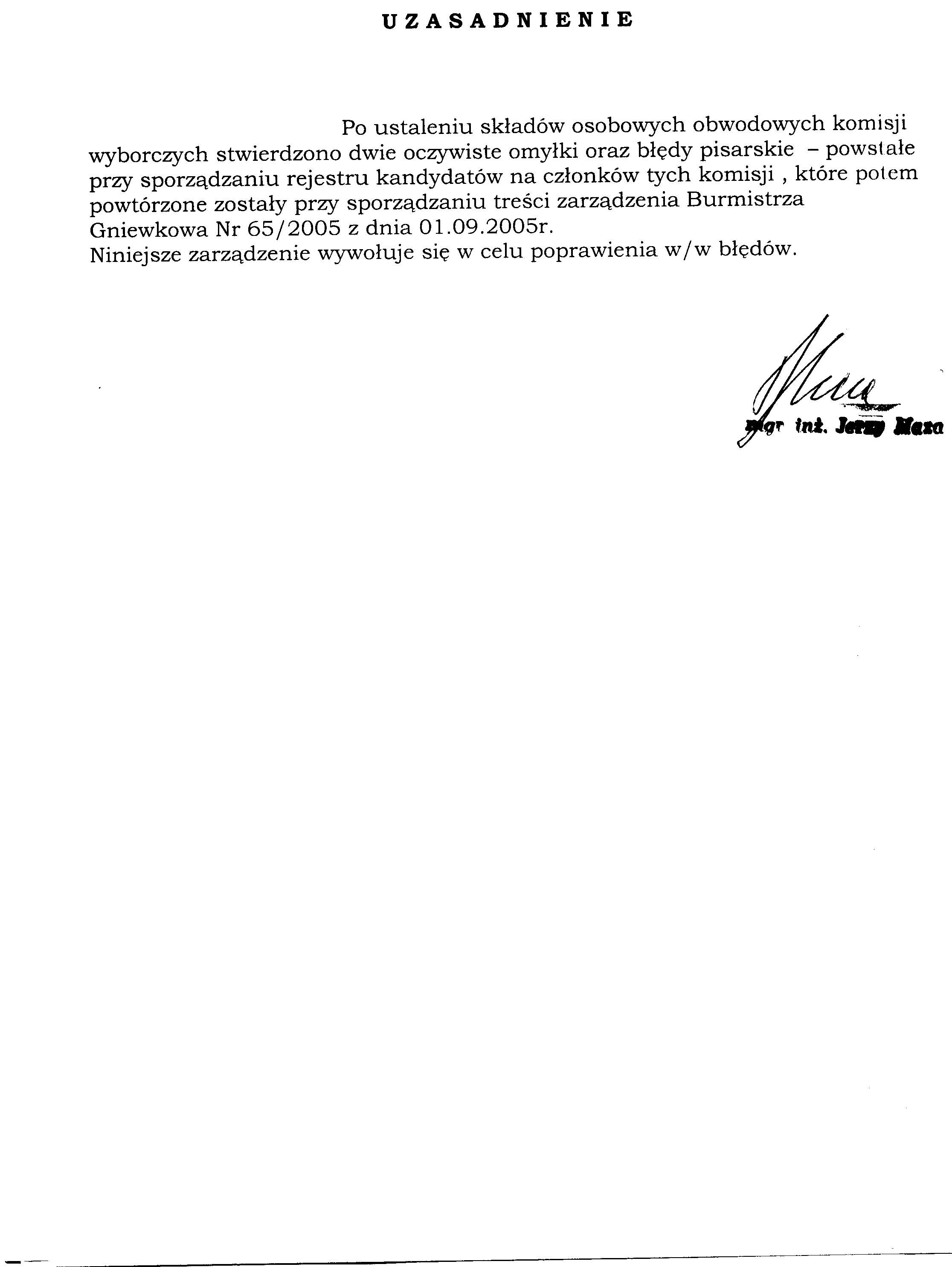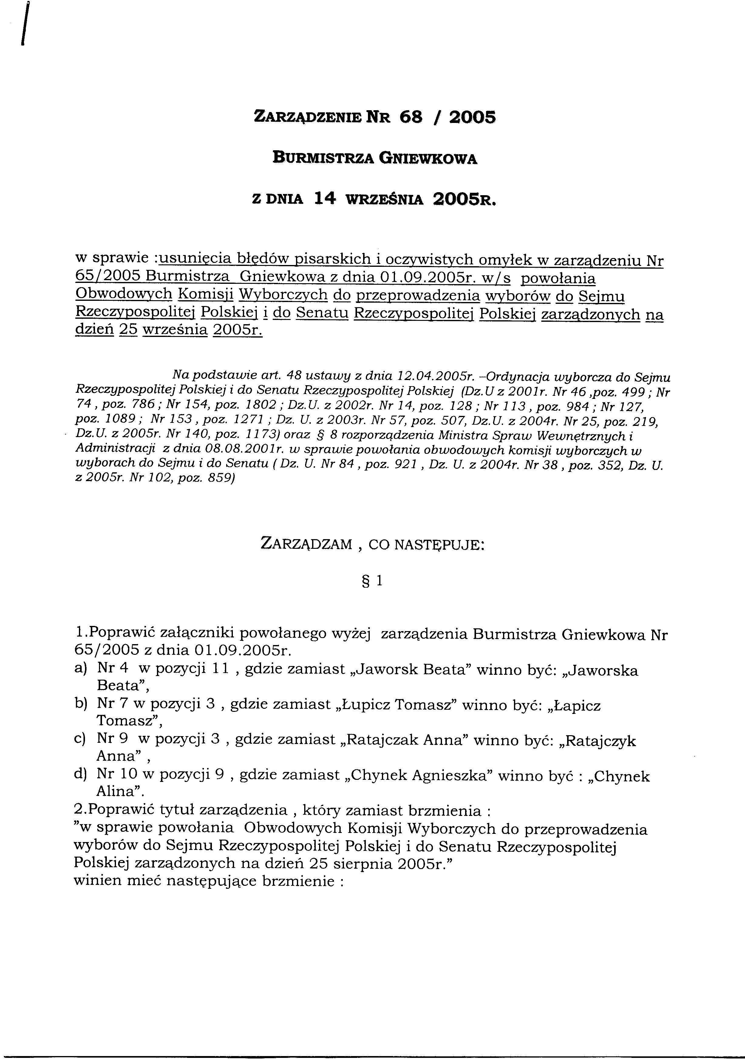 Zarządzenie Burmistrza Gniewkowa Nr 68/2005 z dnia 14 wrzesnia 2005r. w/s usunięcia błędów pisarskich i oczywistych omyłek w zarządzeniu nr 65/2005 Burmistrza Gniewkowa z dnia 01.09.2005r. w/s powołania Obwodowych Komisji Wyborczych do przeprowadzenia wyborów do Sejmu Rzeczypospolitej i Senatu Rzeczypospolitej zarządzonych na dzień 25 września 2005r.
