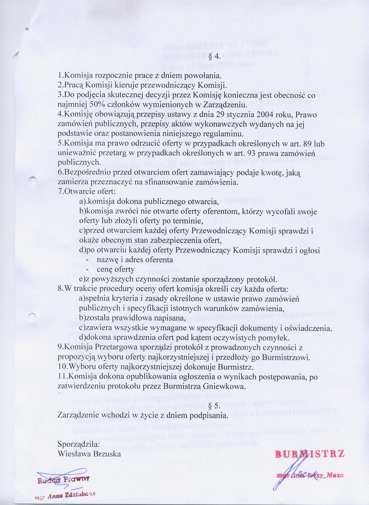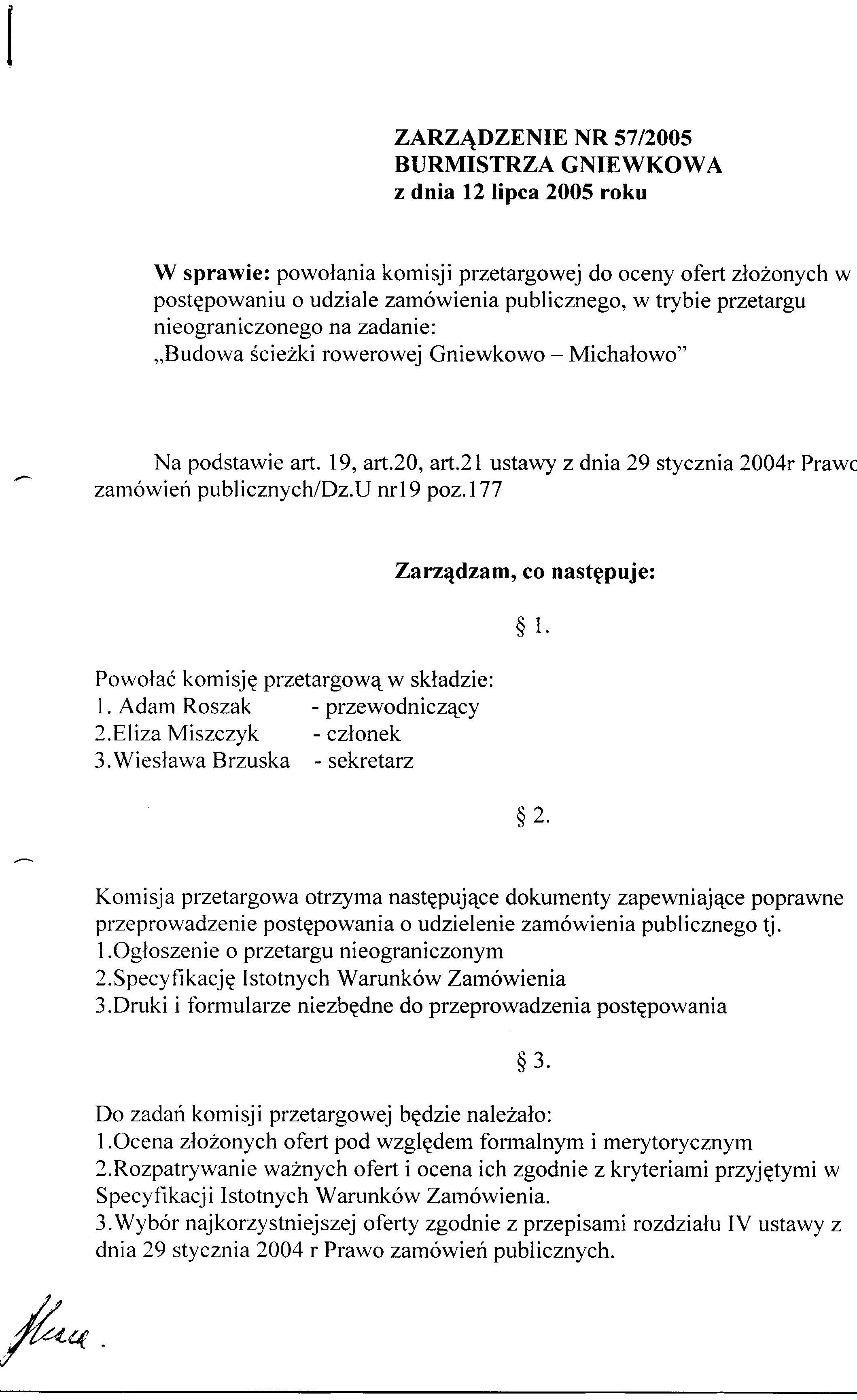 Zarządzenie Burmistrza Gniewkowa Nr 57/2005 z dnia 12 lipca 2005r. w/s powołania komisji przetargowej do oceny ofert złożonych w postępowaniu o udzielenie zamówienia publicznego w trybie przetargu nieograniczonego na zadanie: " Budowa ściezki rowerowej Gniewkowo-Michałowo"