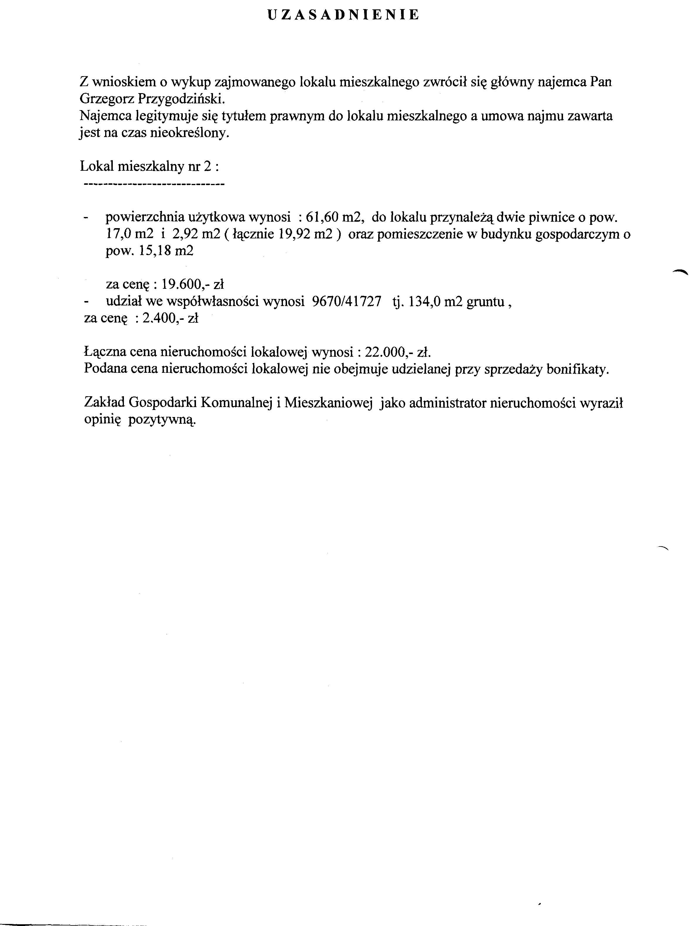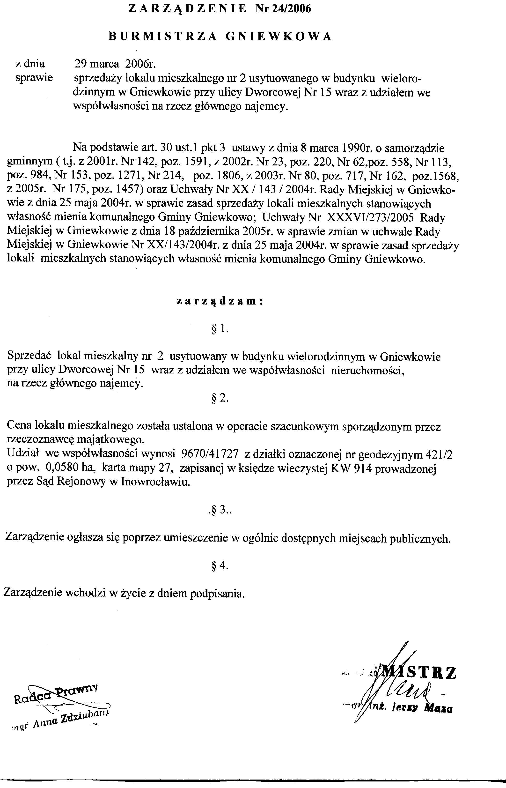 Zarządzenie Nr 24/2006 Burmistrza Gniewkowa z dnia 29 marca 2006r. w/s sprzedaży lokalu mieszkalnego nr 2 usytuowanego w budynku wielorodzinnym w Gniewkowie przy ul.Dworcowej Nr 15 wraz z przynależnym udziałem we współwłasności na rzecz głównego najemcy