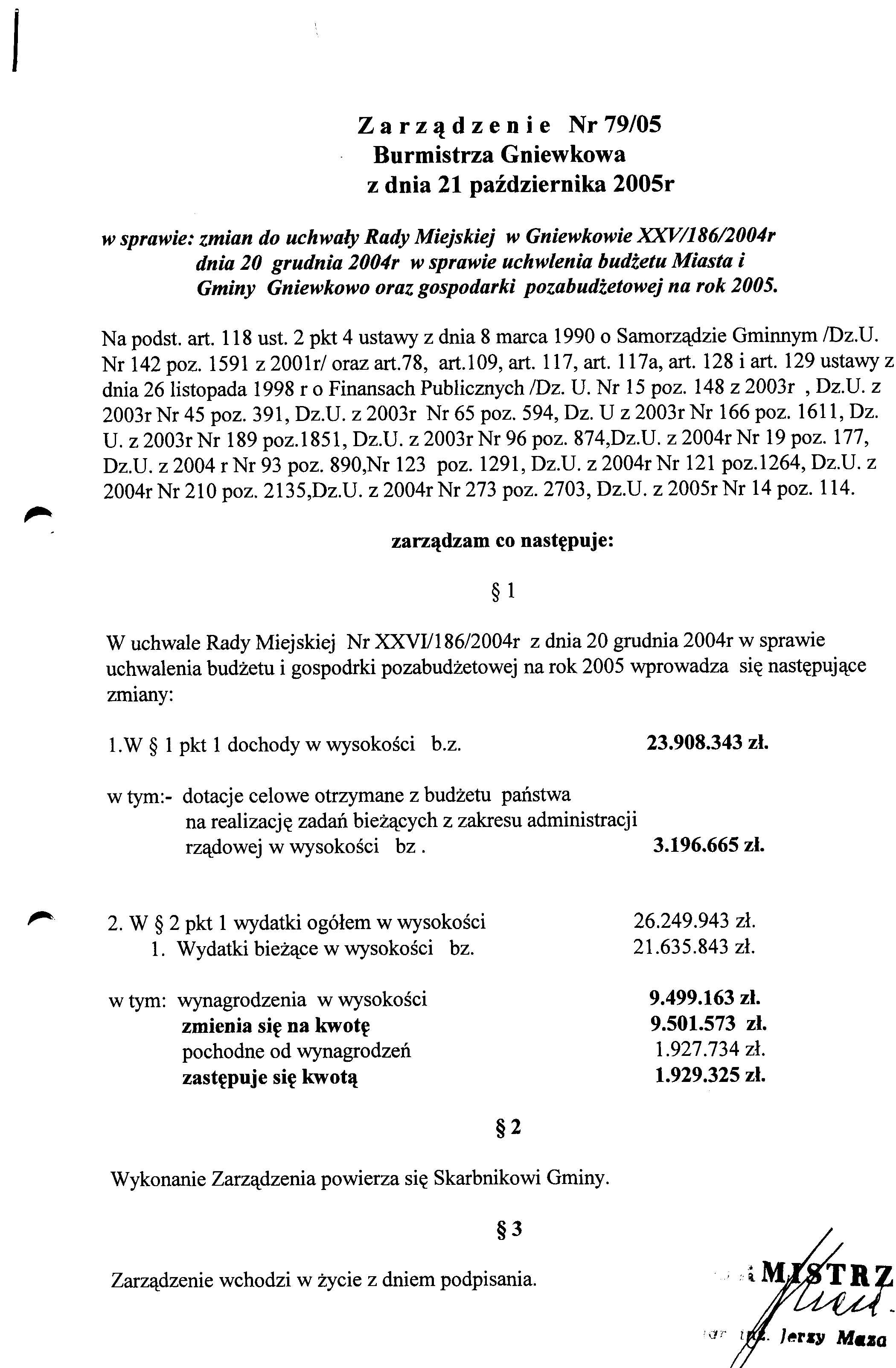Zarządzenie Burmistrza Gniewkowa Nr 79/2005 z dn. 21.10.2005r. w/s zmian do uchwały Rady Miejskiej w Gniewkowie Nr XXV/186/2004 z dn. 20.12.04r. w/s uchwalenia budżetu Miasta i Gminy Gniewkowo oraz gospodarki pozabudżetowej na rok 2005