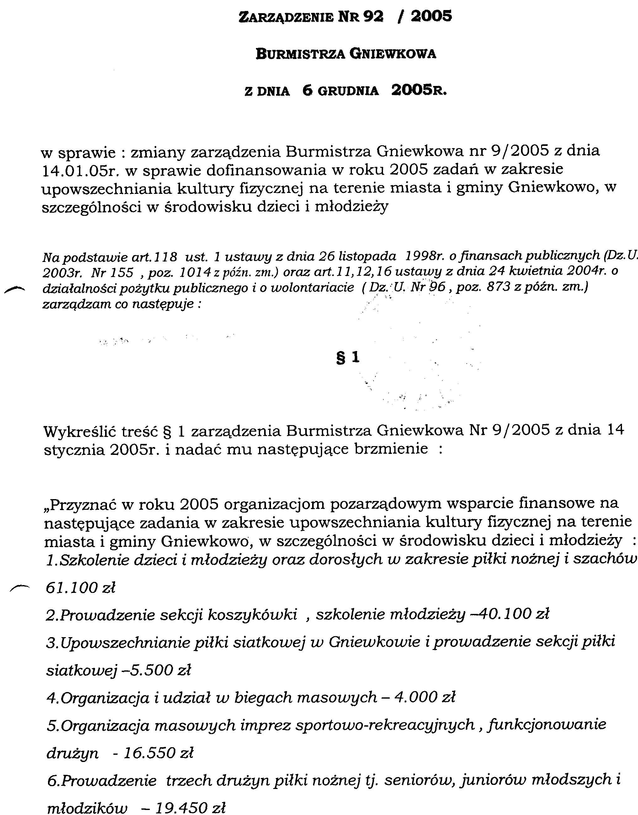 Zarządzenie Burmistrza Gniewkowa nr 92/2005 z dnia 06.12.2005r. w/s zmiany zarządzenia Burmistrza Gniewkowa Nr 9/2005 z dn. 14.01.05r. w/s dofinansowania w roku 2005 zadań w zakresie upowszechniania kultury fizycznej na terenie miasta i gminy Gniewkowo , w szczególności w środowisku dzieci i młodzieży.