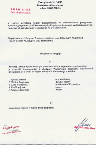Zarządzenie Nr 34/05 Burmistrza Gniewkowo z dn. 18.05.05r. w/s powołania Komisji Egzaminacyjnej do przeprowadzenia postępowania egazminacyjnego nauczycieli kontraktowych ubiegających się o awans na stopień nauczycieli mianowanych zatrudnionych w Szkole Podstawowej Nr 1 w Gniewkowie