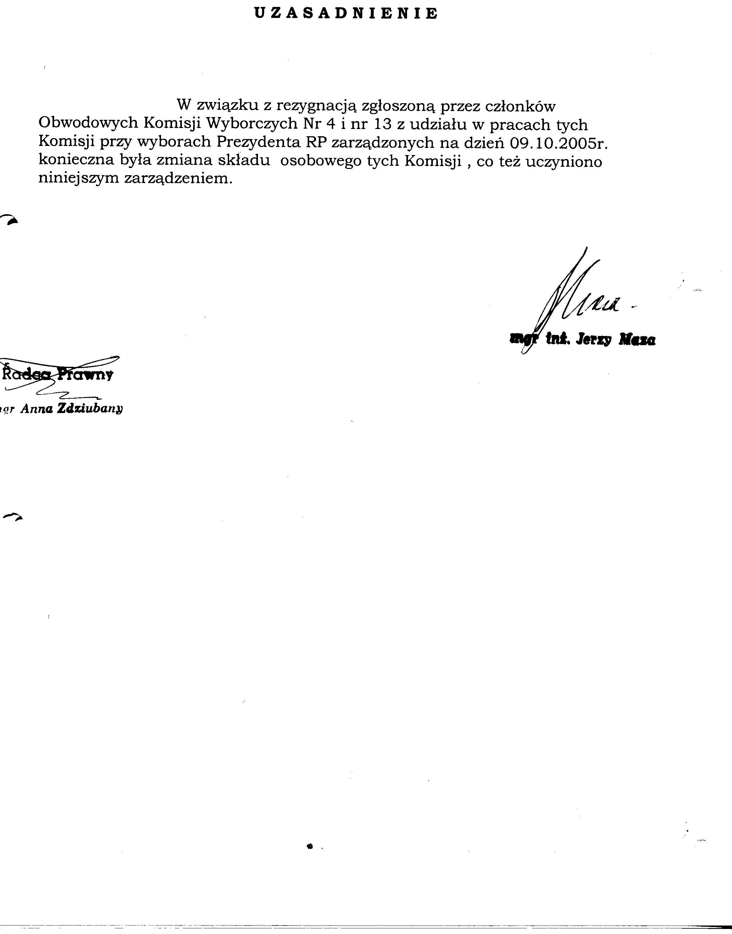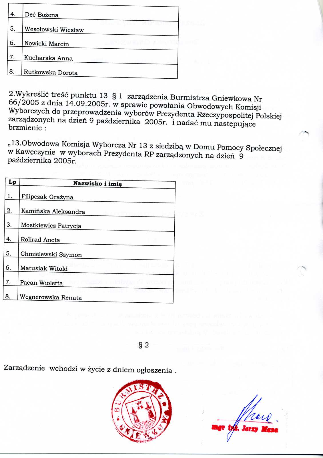 Zarządzenie Burmistrza Gniewkowa Nr 73/2005 z dnia 03.10.2005r. w/s zmiany zarządzenia Burmistrza Gniewkowa Nr 66/2005 z dnia 14.09.05r. w/s powołania Obwodowych Komisji Wyborczych do przeprowadzenia wyborów Prezydneta Rzeczypospolitej Polskiej zarządzonych na dzień 09.10.05r.