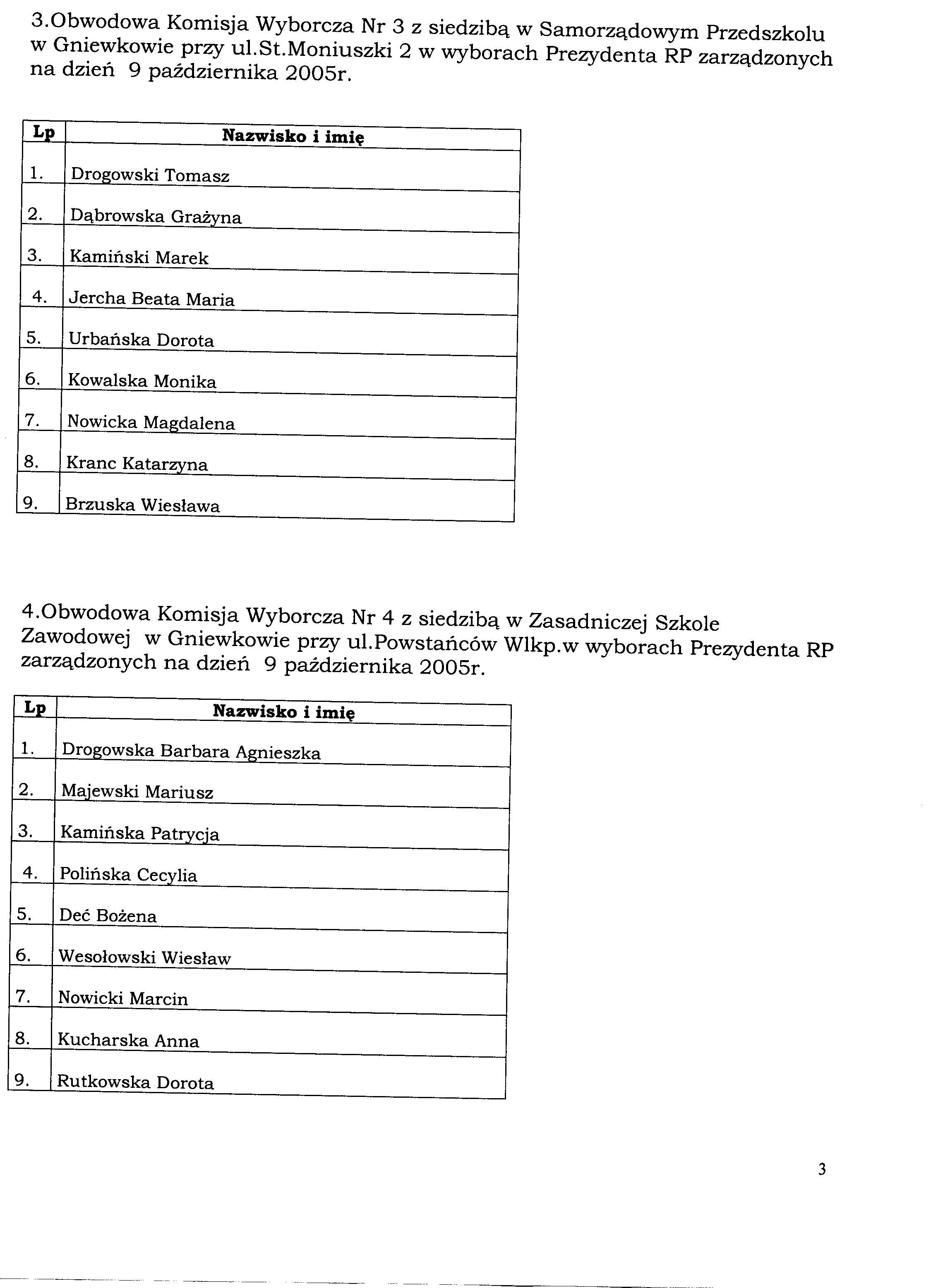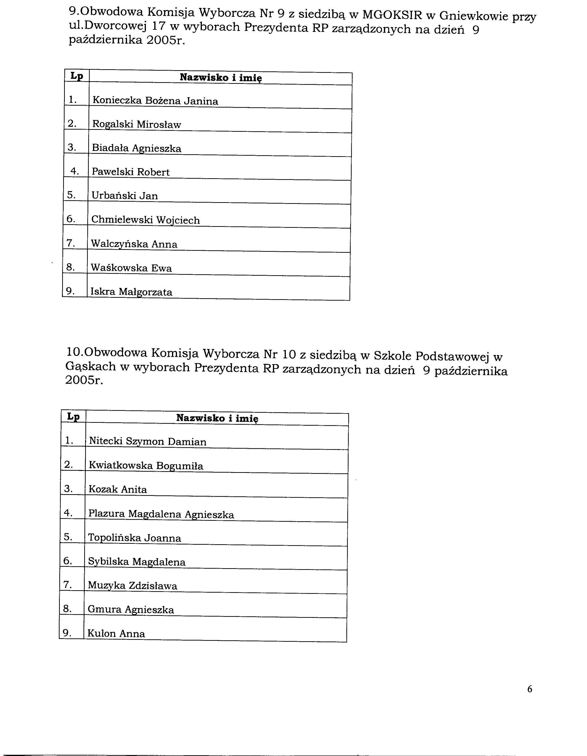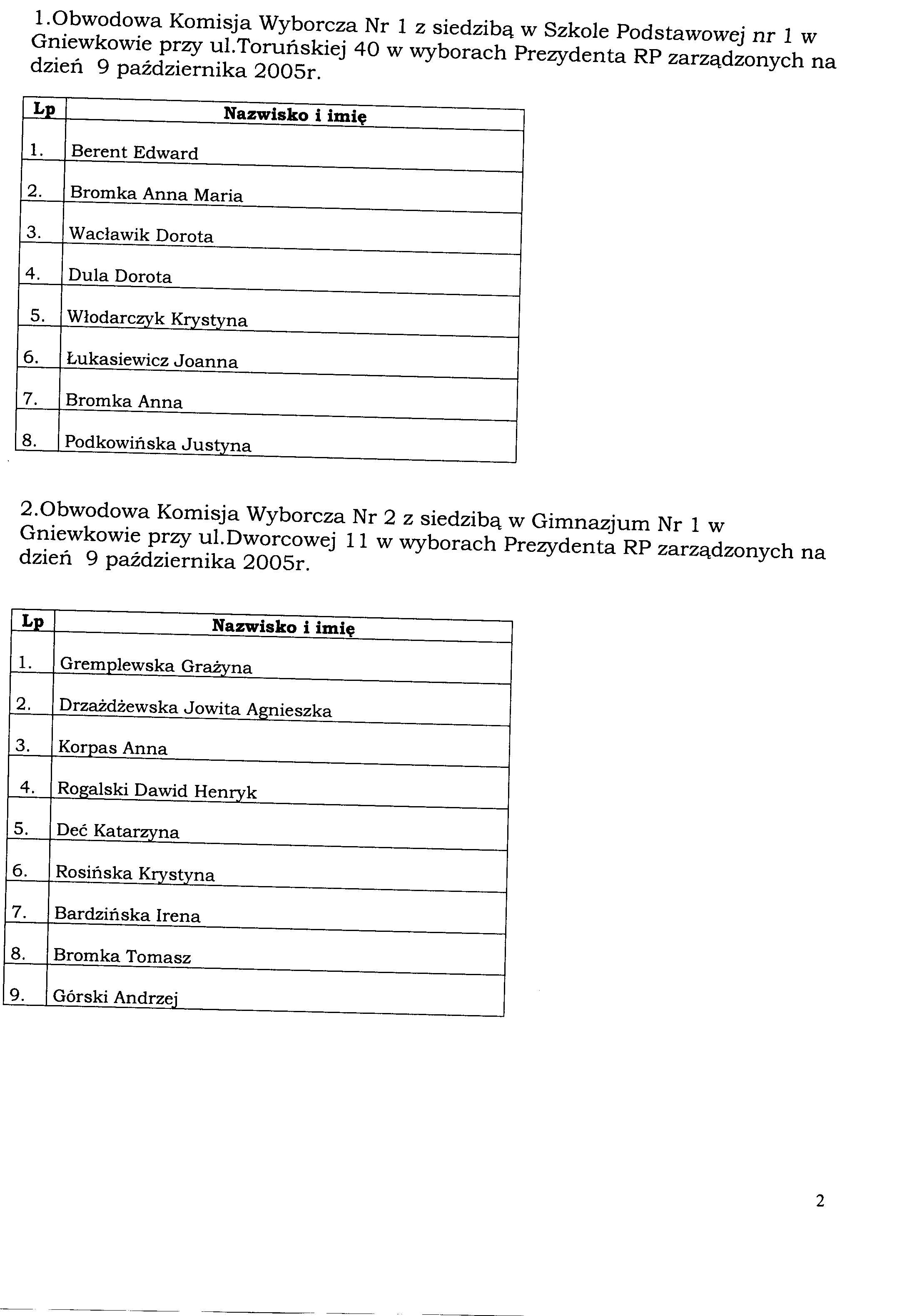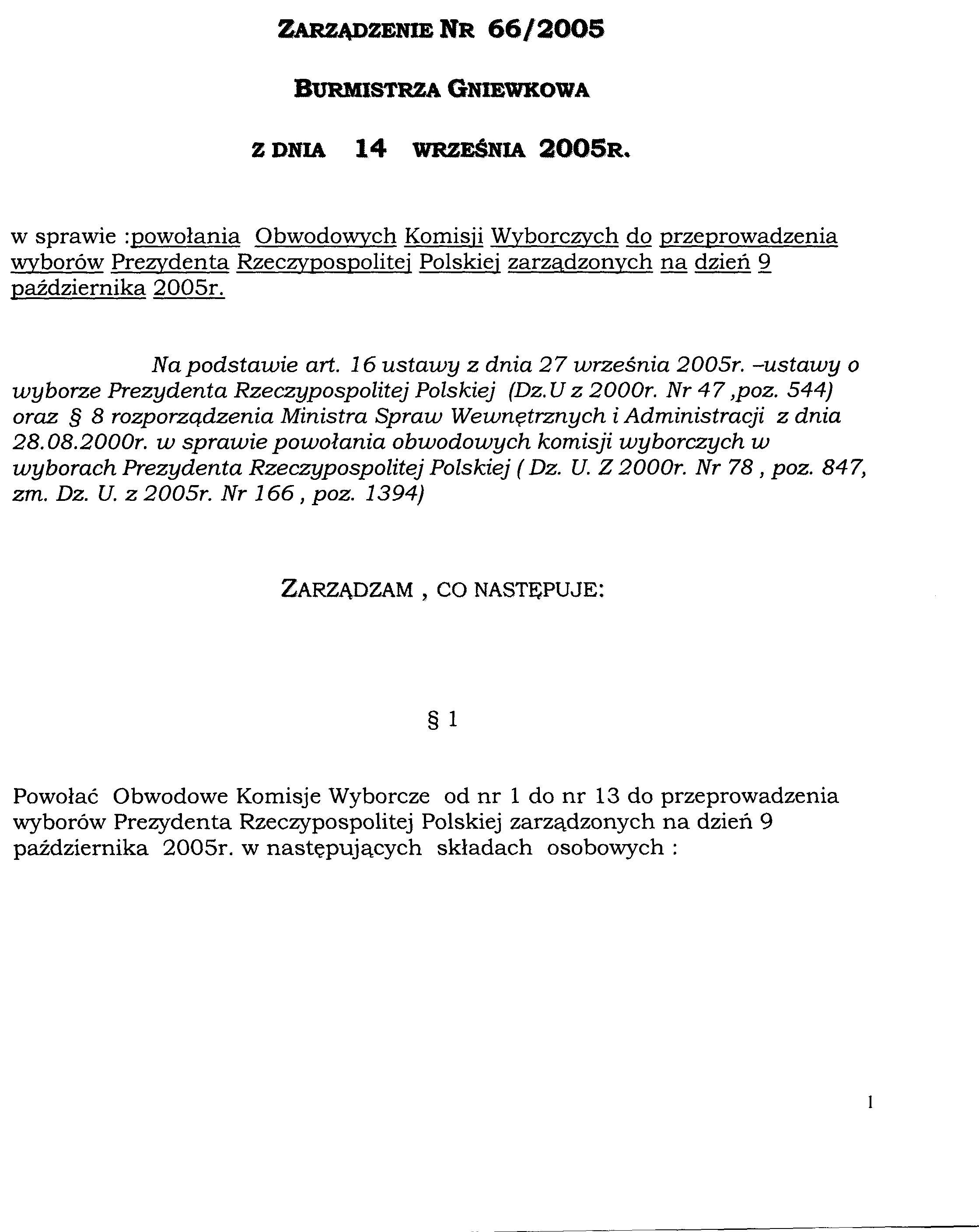Zarządzenie Burmistrza Gniewkowa Nr 66/2005 z dnia 14.09.2005r. w/s powołania obwodowych komisji wyborczych do przeprowadzenia wyborów Prezydenta RP zarządzonych na dzień 09.10.2005r.