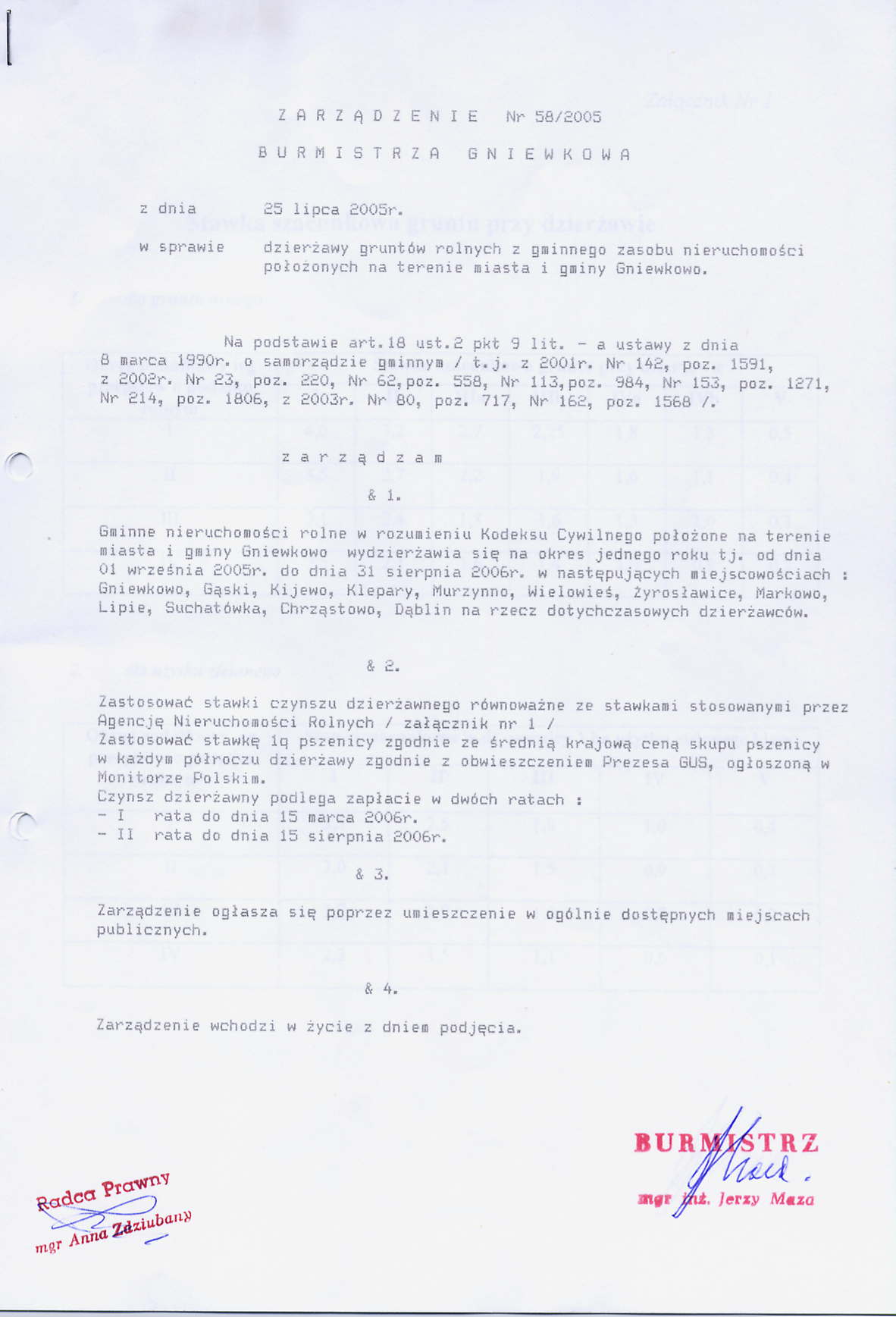 Zarządzenie Burmistrza Gniewkowa Nr 58/2005 z dnia 25 lipca 2005r. w sprawie dzierżawy gruntów rolnych z gminnego zasobu nieruchomości położonych na terenie miasta i gminy Gniewkowo