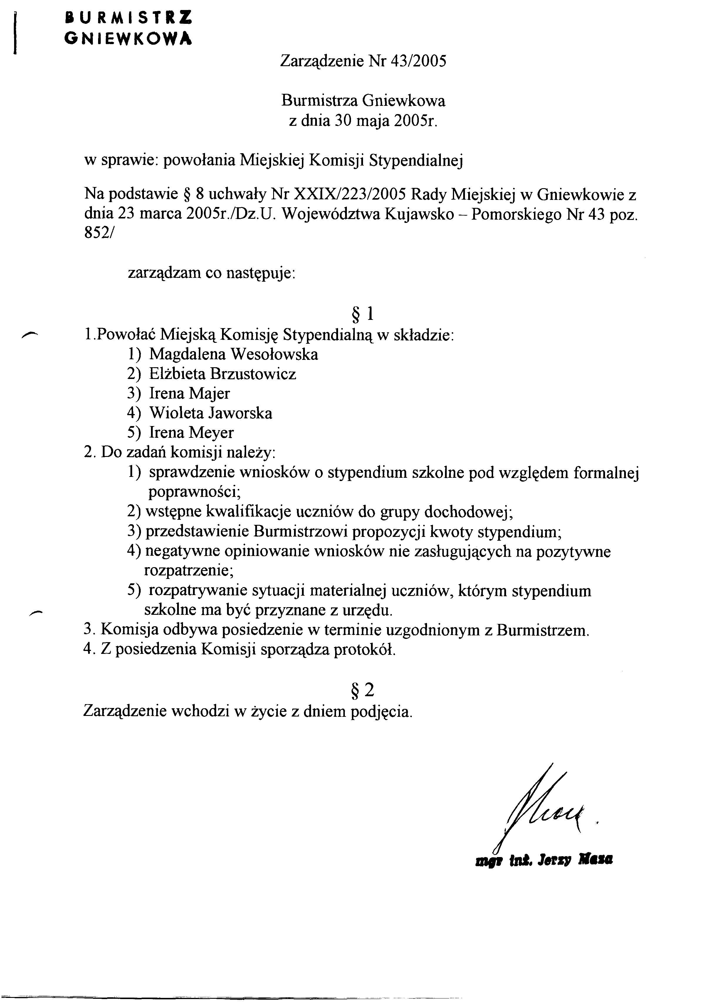 Zarządzenie Burmistrza Gniewkowa Nr 43/2005 z dnia 30 maja 2005r. w/s powołania Miejskiej Komisji Stypendialnej