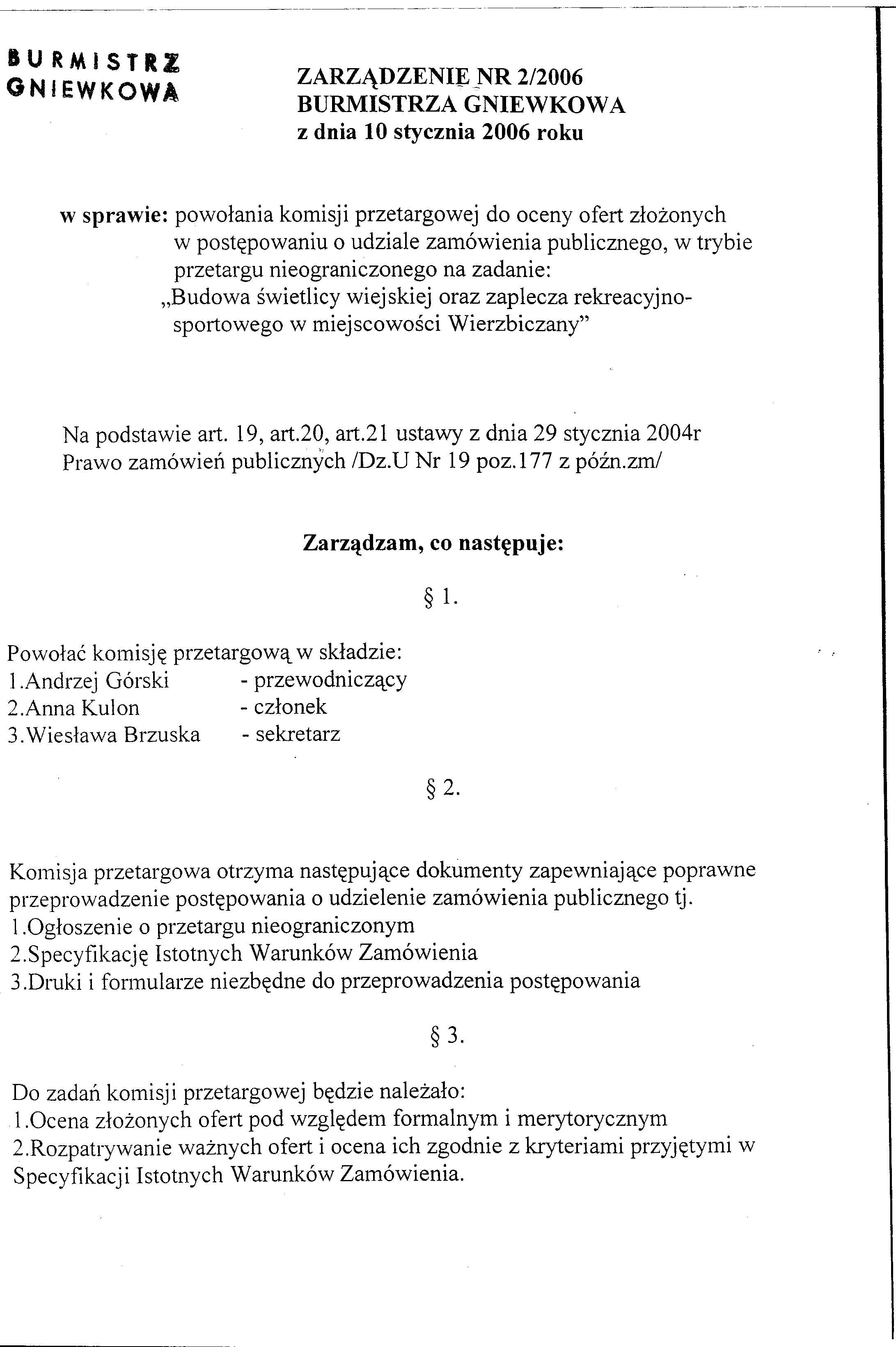 Zarządzenie Nr 2/2006 Burmistrza Gniewkowa z dnia 10.01.2006r. w/s powołania komisji przetargowej do oceny ofert złożonych w postępowaniu o udzielenie zamówienia publicznego , w trybie przetargu nieograniczonego na zadanie : "Budowa świetlicy wiejskiej oraz zaplecza rekreacyjno-sportowego w miejscowości Wierzbiczany".