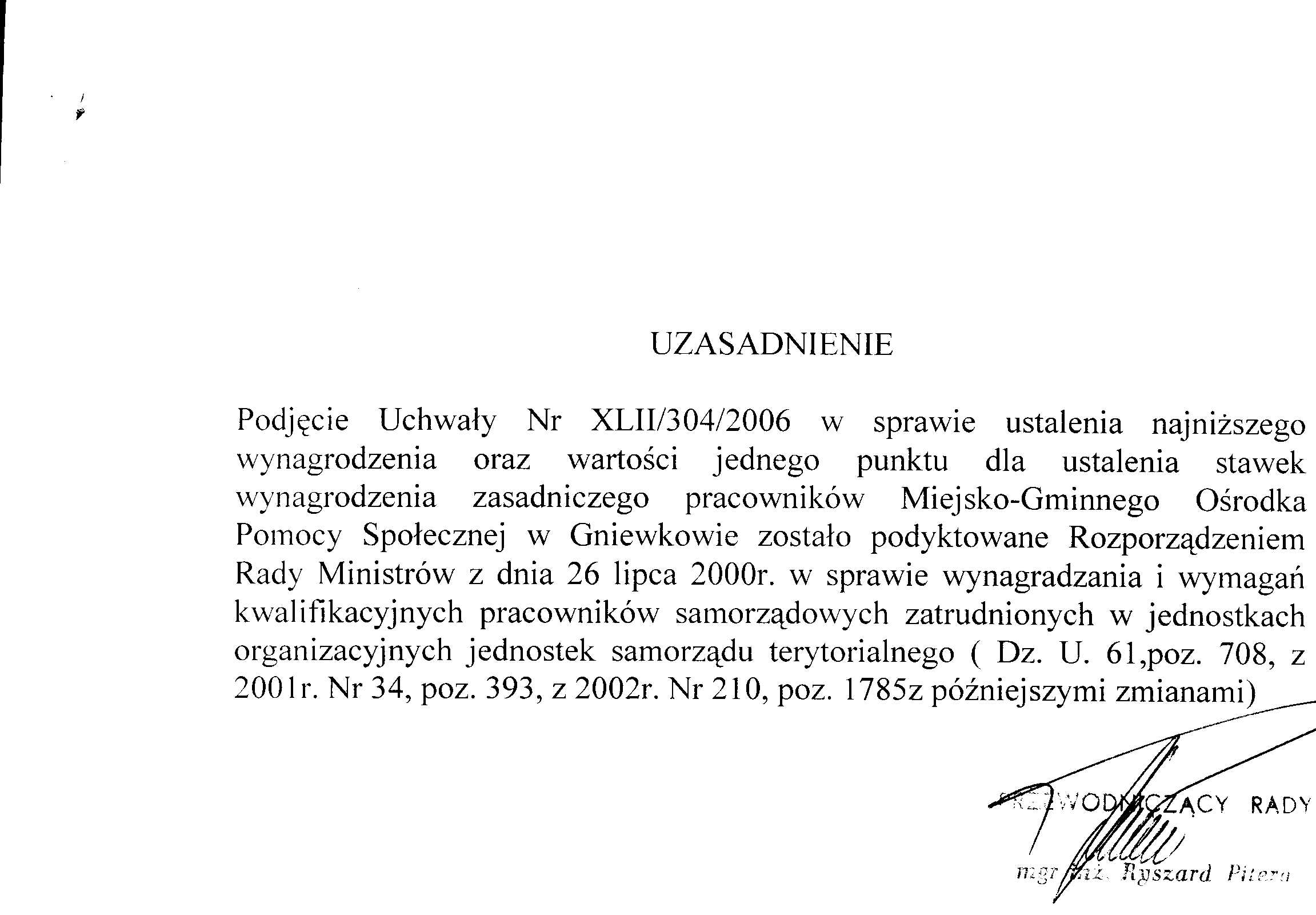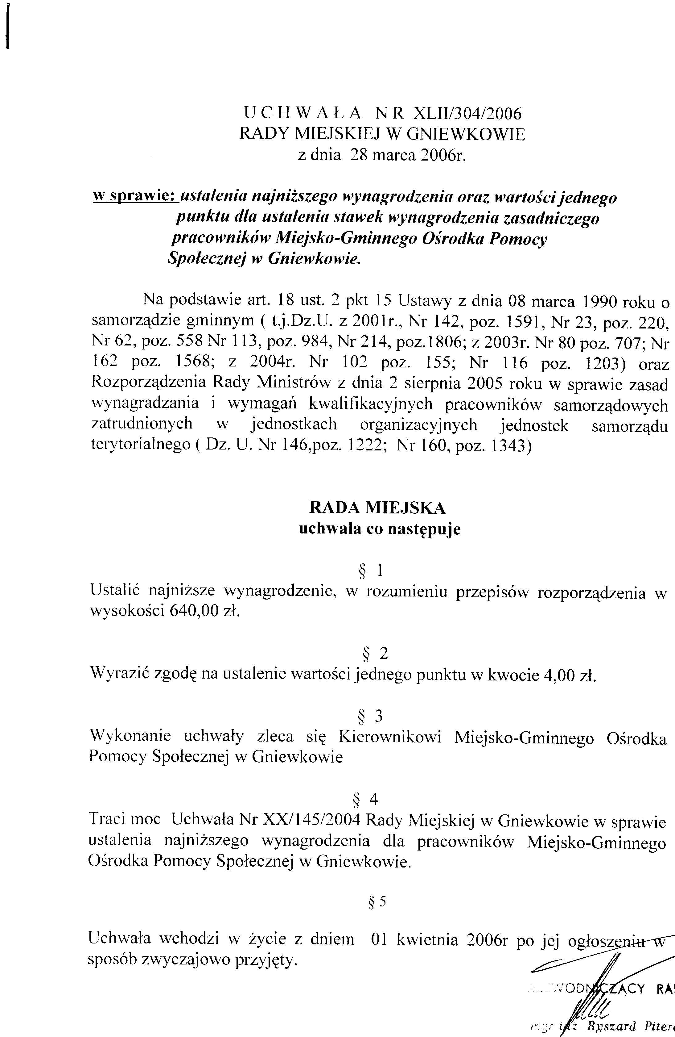 Uchwała Nr XLII/304/2006 Rady Miejskiej w Gniewkowie z dnia 28.03.2006r. w/s ustalenia najniższego wynagrodzenia oraz wartości jednego punktu dla ustalenia stawek wynagrodzenia zasadniczego pracowników Miejsko-Gminnego Ośrodka Pomocy Społecznej w Gniewkowie