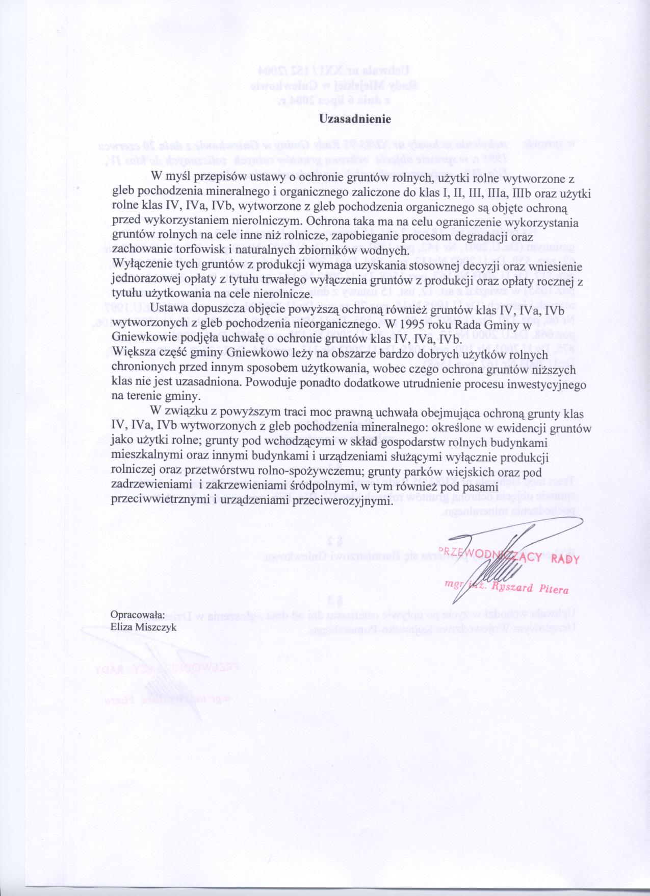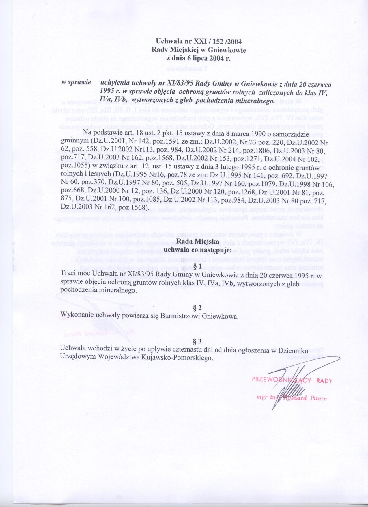 Uchwała Nr XXI/152/2004 z dn. 06.07.04r. w/s uchylenia uchwały Nr XI/83/95 Rady Gminy w Gniewkowie z dnia 20 czerwca 1995r. w/s objęcia ochroną gruntów rolnych zaliczonych do klas IV , IVa,IVb, wytworzonych z gleb pochodzenia mineralnego.