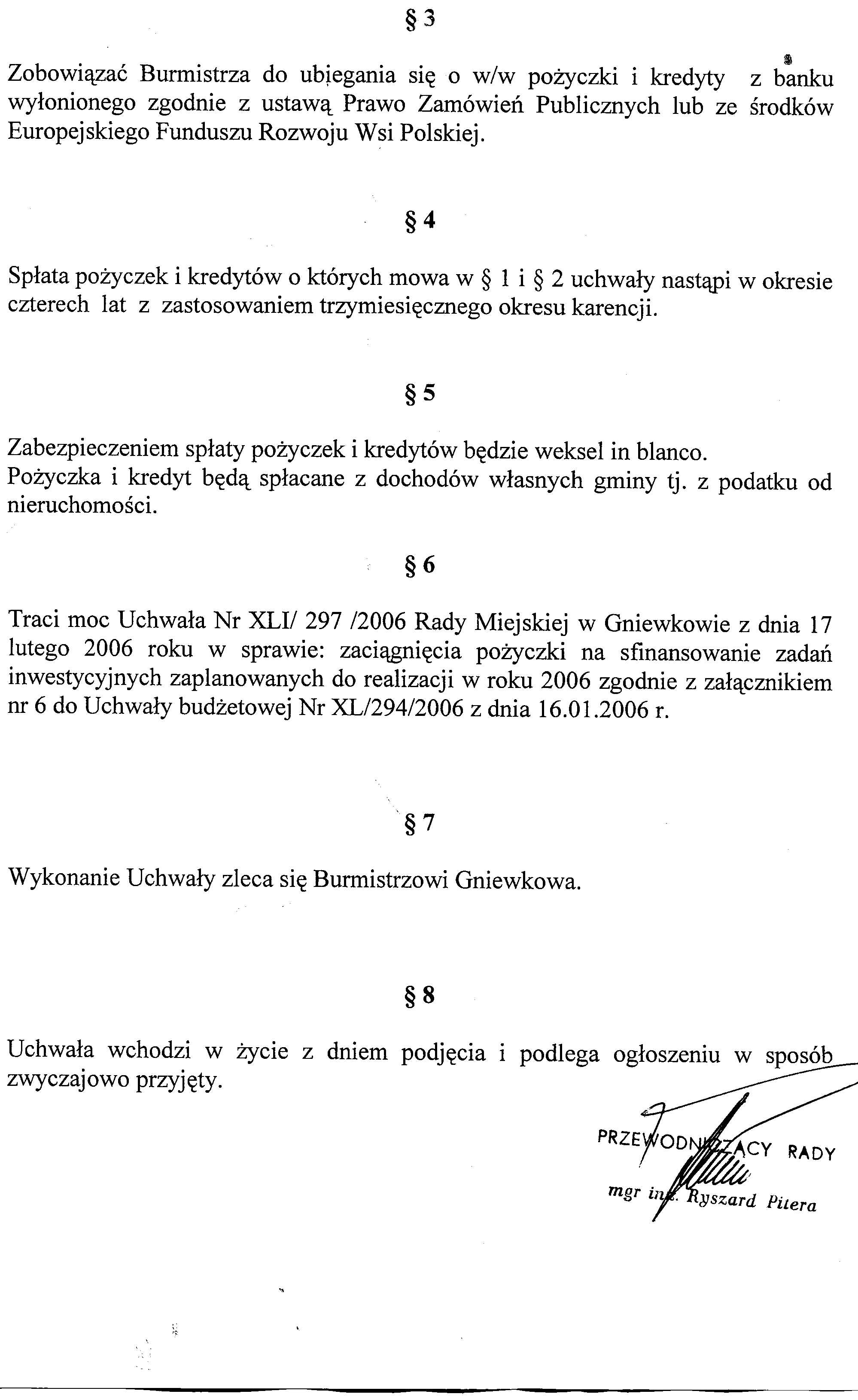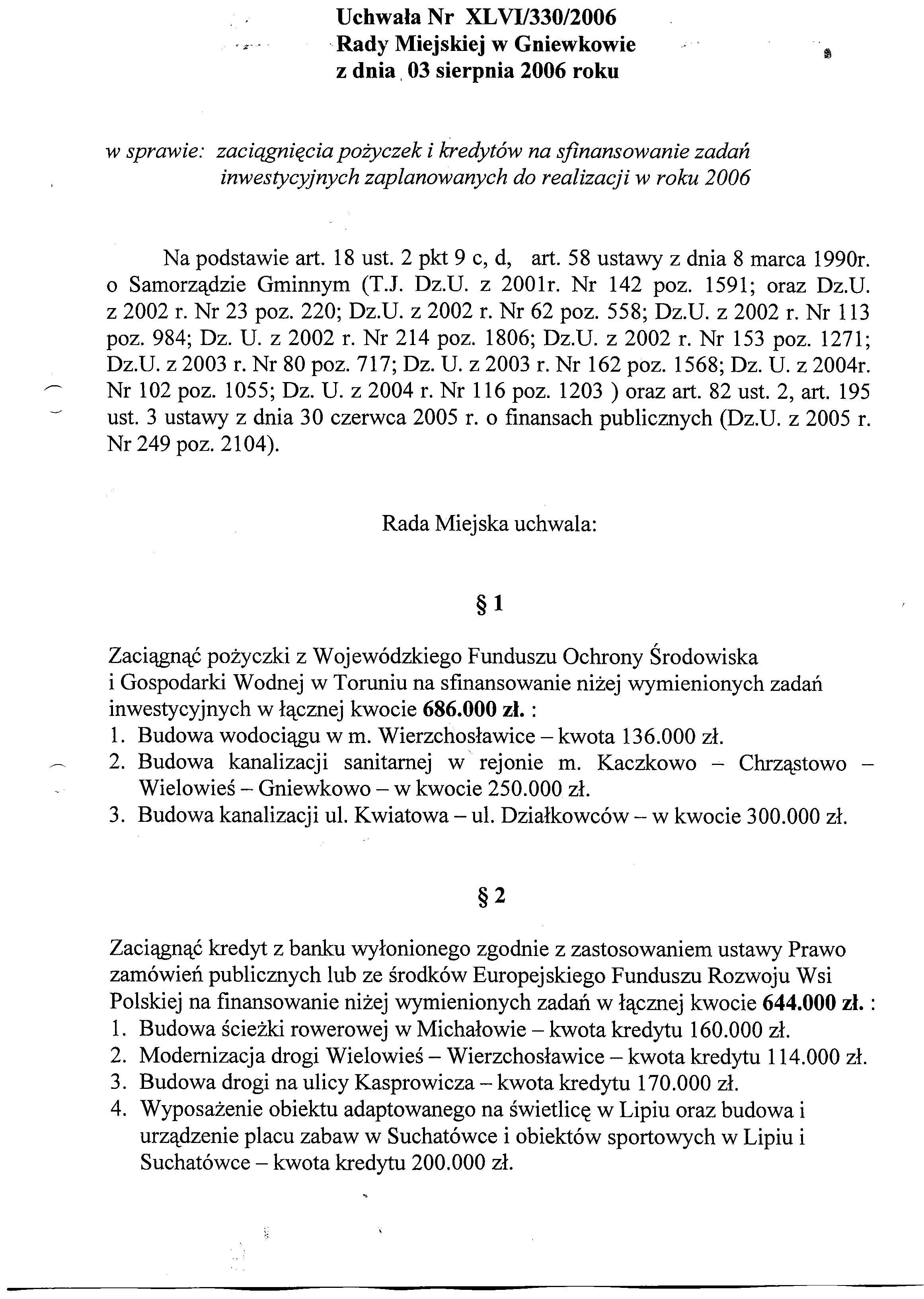 Uchwała Nr XLVI/330/2006 z dnia 03.08.06r. w/s zaciągnięcia pożyczek i kredytów na sfinansowanie zadań inwestycyjnych zaplanowanych do realizacji w roku 2006