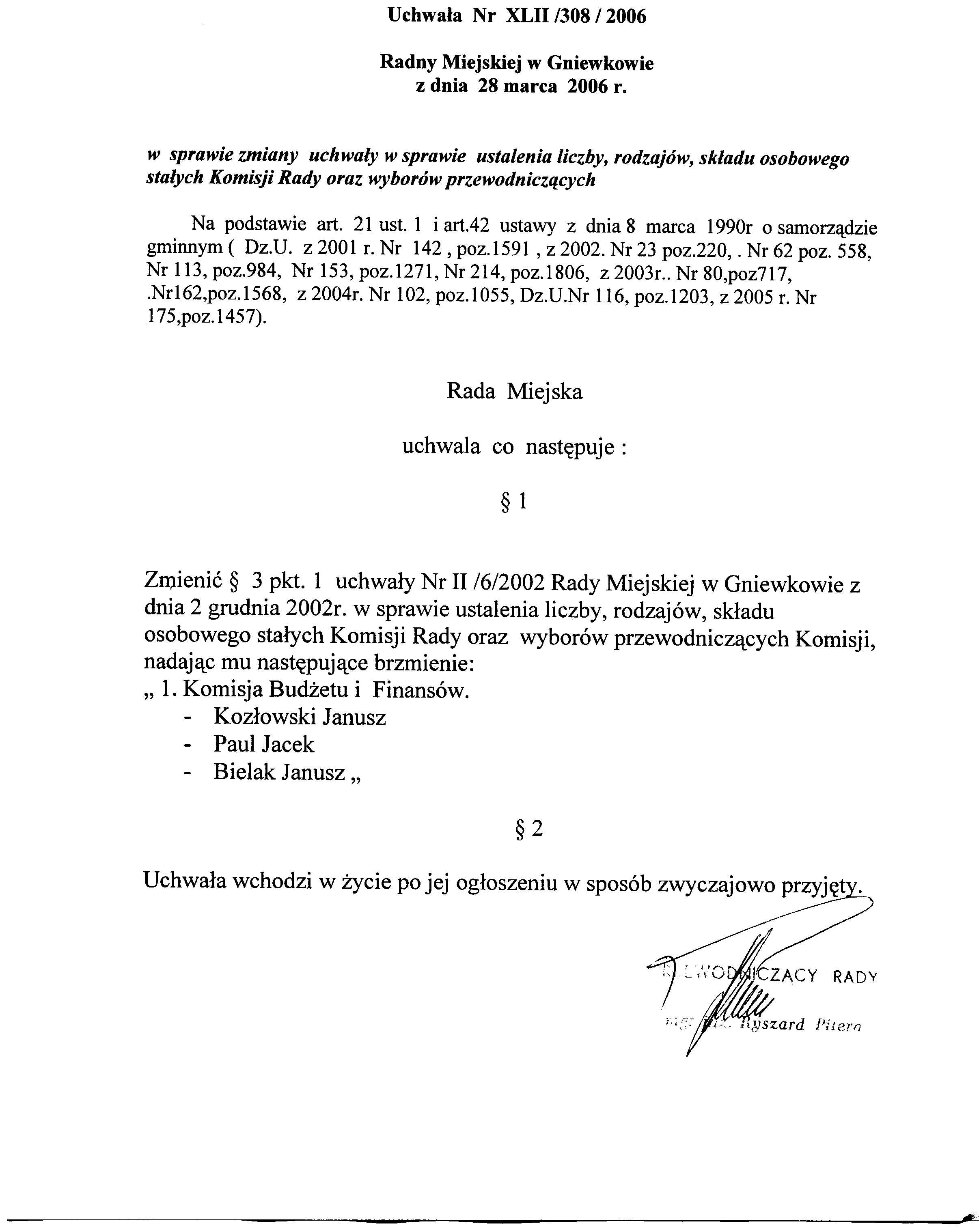 Uchwała Nr XLII/308/2006 Rady Miejskiej w Gniewkowie z dnia 28.03.2006r. w/s zmian uchwały w/s ustalenia liczby , rodzajów , składu osobowego stałych Komisji Rady oraz wyborów przewodniczących