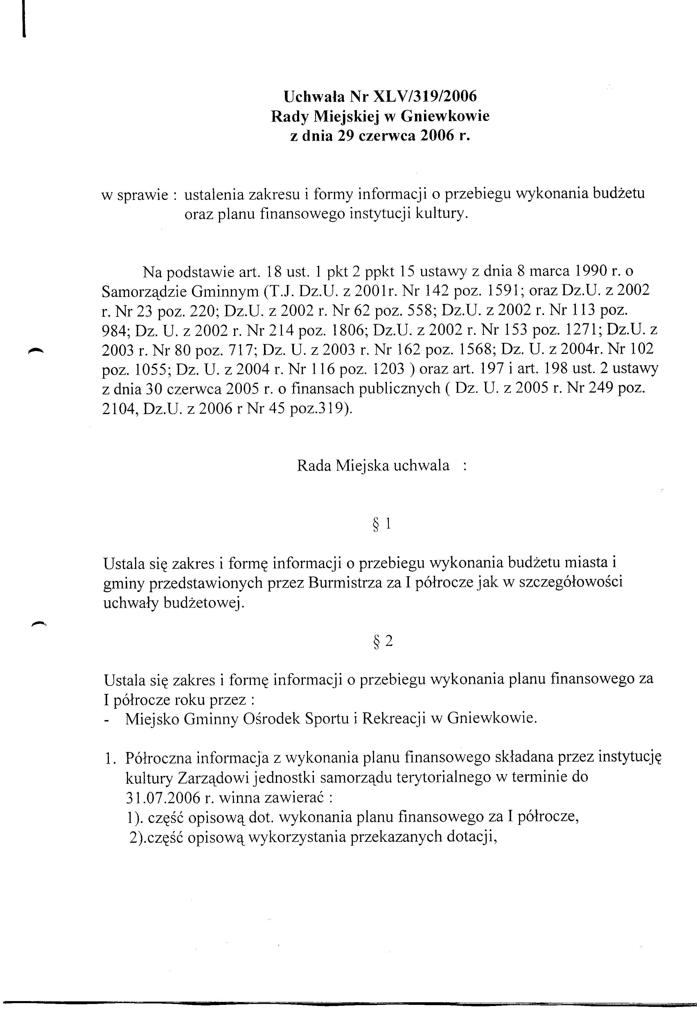 Uchwała Nr XLV/319/2006 Rady Miejskiej w Gniewkowie z dnia 29.06.06r. w/s ustalenia zakresu i formy informacji o przebiegu wykonania budżetu ora planu finansowego instytucji kultury