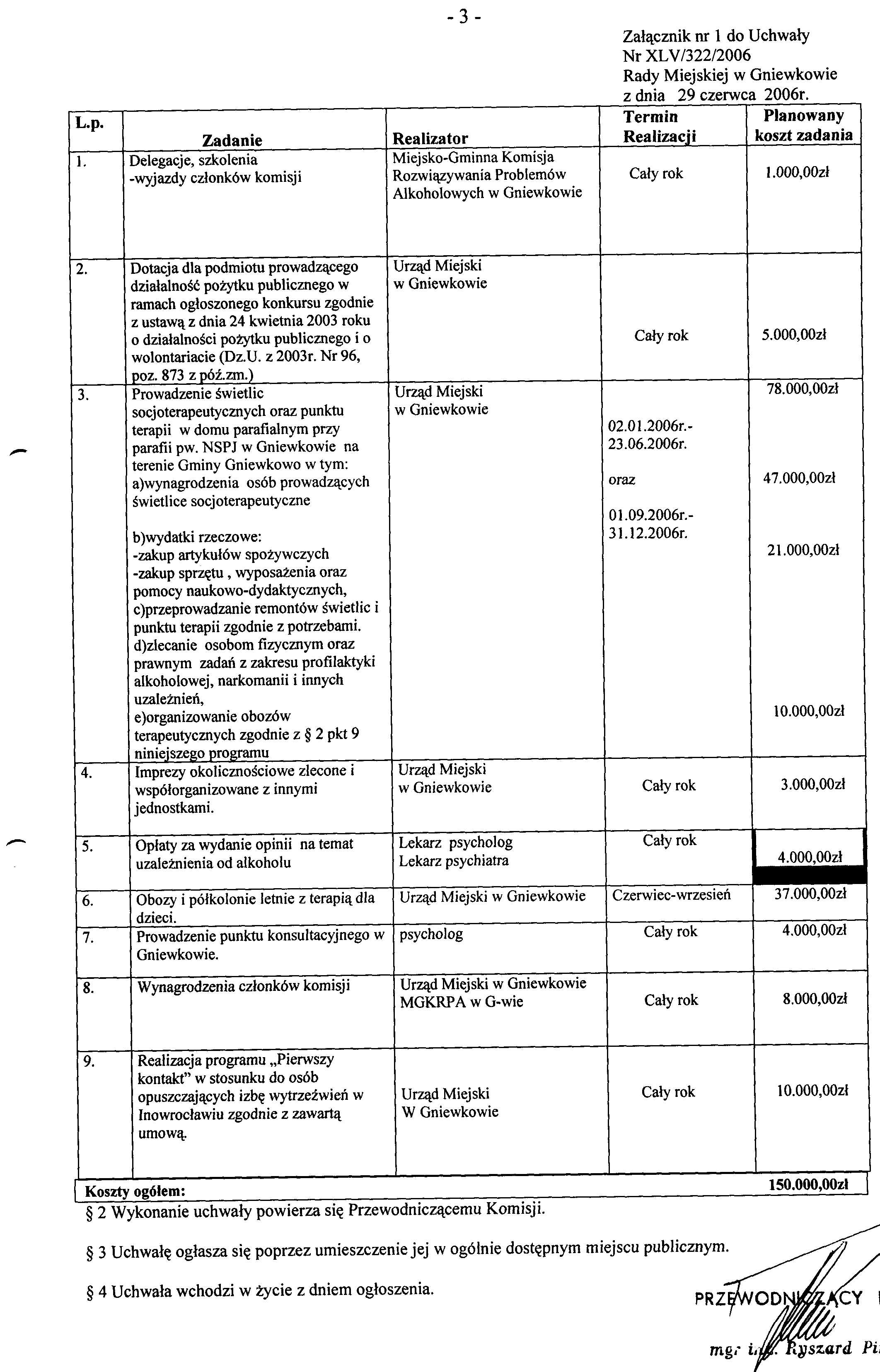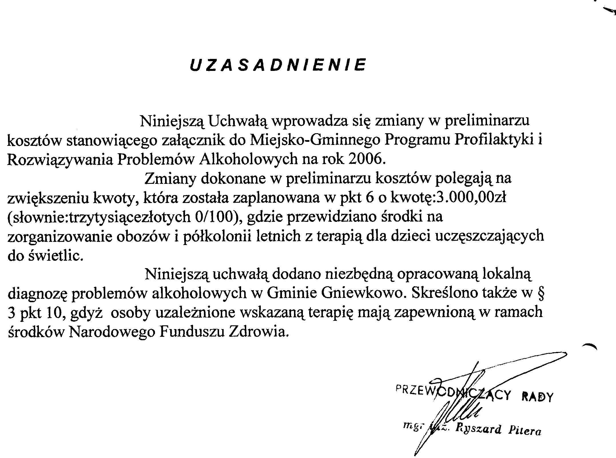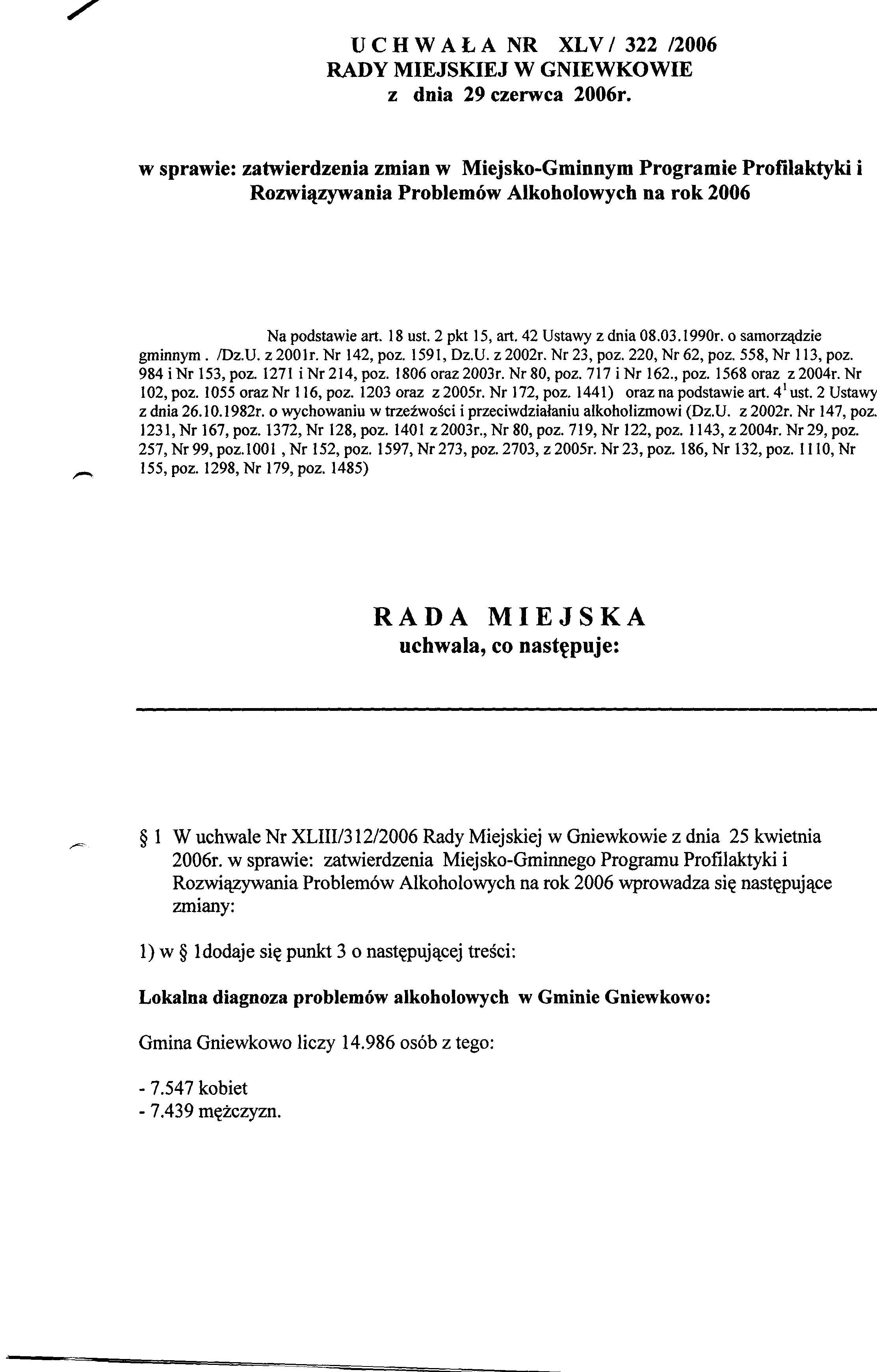 Uchwała Nr XLV/322/2006 Rady Miejskiej w Gniewkowie z dnia 29.06.06r. w/s zatwierdzenia zmian w Miejsko-Gminnym Programie Profilaktyki i Rozwiązywania Problemów Alkoholowych na rok 2006