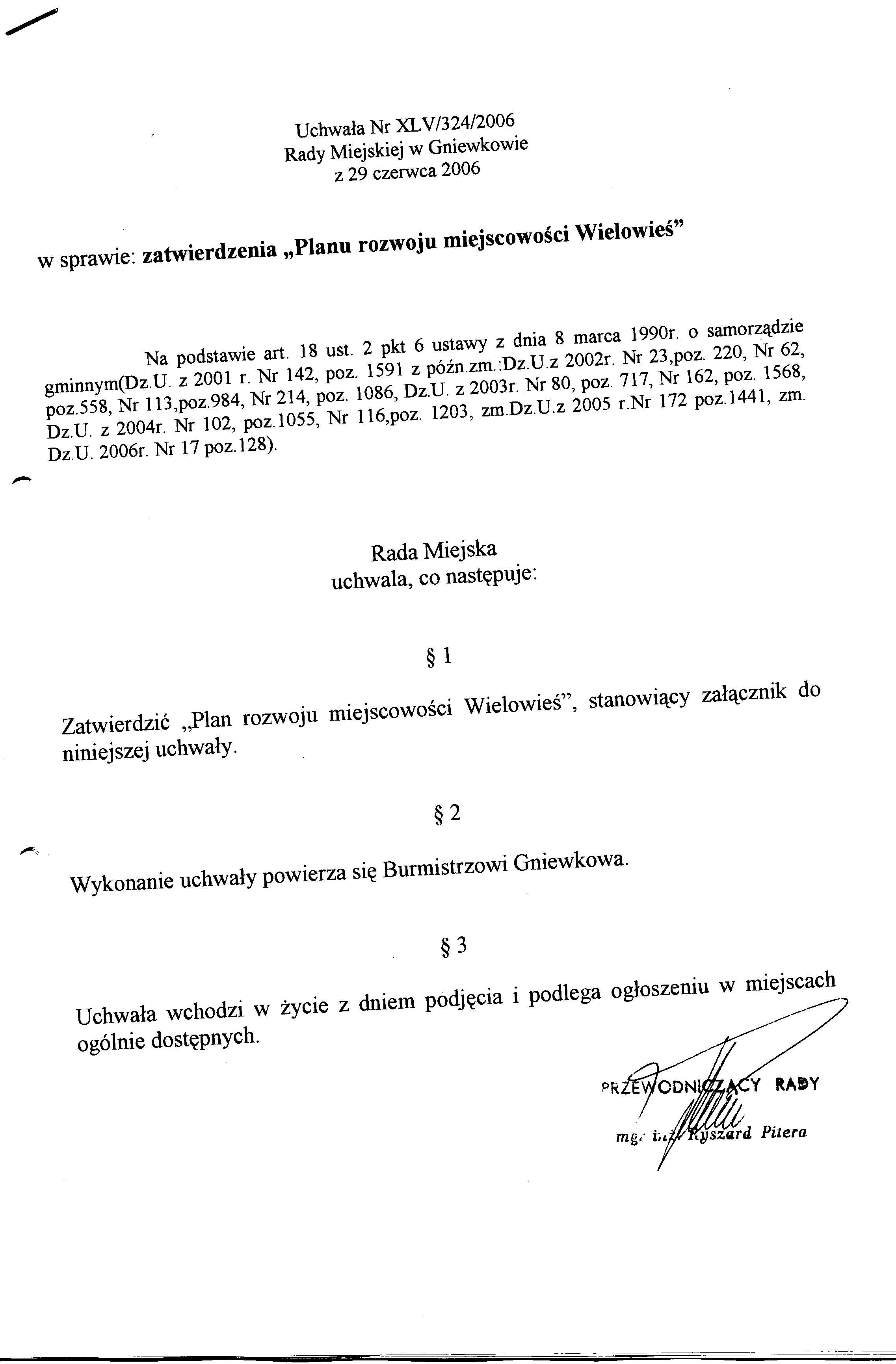 Uchwała Nr XLV/324/2006 Rady Miejskiej w Gniewkowie z dnia 29.06.06r. w/s zatwierdzenia "Planu rozwoju miejscowości Wielowieś"